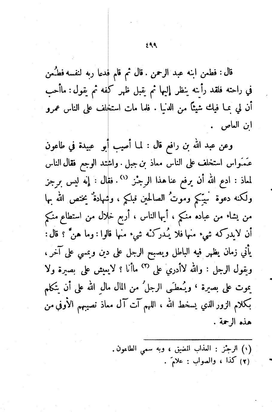 وعن عبد الله بن رافع قال لما أصيب أبو عبيدة في طاعون عمواس استخلف على الناس معاذ بن جبل واشتد الوجع فقال الناس لمعاذ ادع الله أن يرفع عنا هذا الرجز فقال إنه ليس برجز ولكنه دعوة نبيكم وموت الصالحين قبلكم وشهادة يختص الله بها من يشاء من عباده منكم أيها الناس أربع خلال من استطاع منكم أن لا يدركه شيء منها فلا يدركه شيء منها قالوا وما هن قال يأتي زمان يظهر فيه الباطل ويصبح الرجل على دين ويمسي على آخر ويقول الرجل والله لا أدري على ما أنا لا يعيش على بصيرة ولا يموت على بصيرة ويعطى الرجل من المال مال الله على أن يتكلم بكلام الزور الذي يسخط الله اللهم آت آل معاذ نصيبهم الأوفى من هذه الرحمة