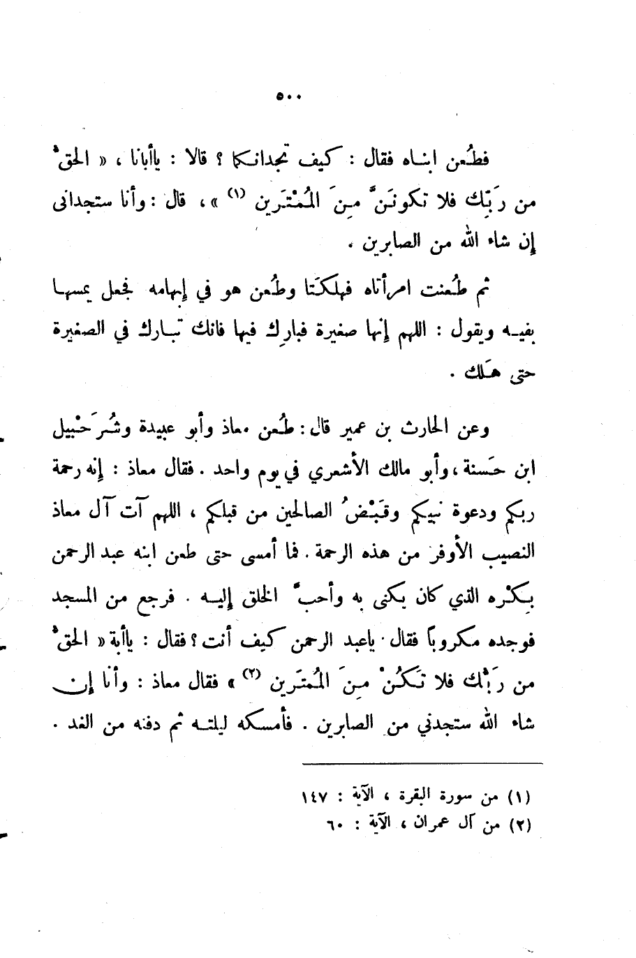 وعن الحارث بن عمير قال طعن معاذ وأبو عبيدة وشرحبيل ابن حسنة وأبو مالك الأشعري في يوم واحد فقال معاذ إنه رحمة ربكم ودعوة نبيكم وقبض الصالحين من قبلكم اللهم آت آل معاذ النصيب الأوفر من هذه الرحمة فما أمسى حتى طعن ابنه عبد الرحمن بكره الذي كان يكنى به وأحب الخلق إليه فرجع من المسجد فوجده مكروبا فقال يا عبد الرحمن كيف أنت فقال يا أبة الحق من ربك فلا تكن من الممترين فقال معاذ وأنا إن شاء الله ستجدني من الصابرين فأمسكه ليلته ثم دفنه من الغد