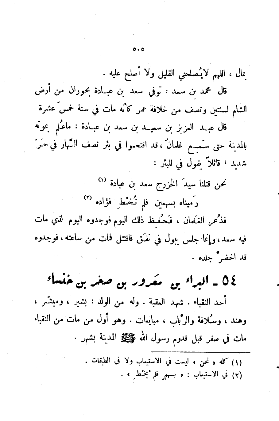 فذعر الغلمان فحفظ ذلك اليوم فوجدوه اليوم لذي مات فيه سعد وإنما جلس يبول في نفق فاقتتل فمات من ساعته فوجدوه قد اخضر جلده 54 البراء بن معرور بن صخر بن خنساء