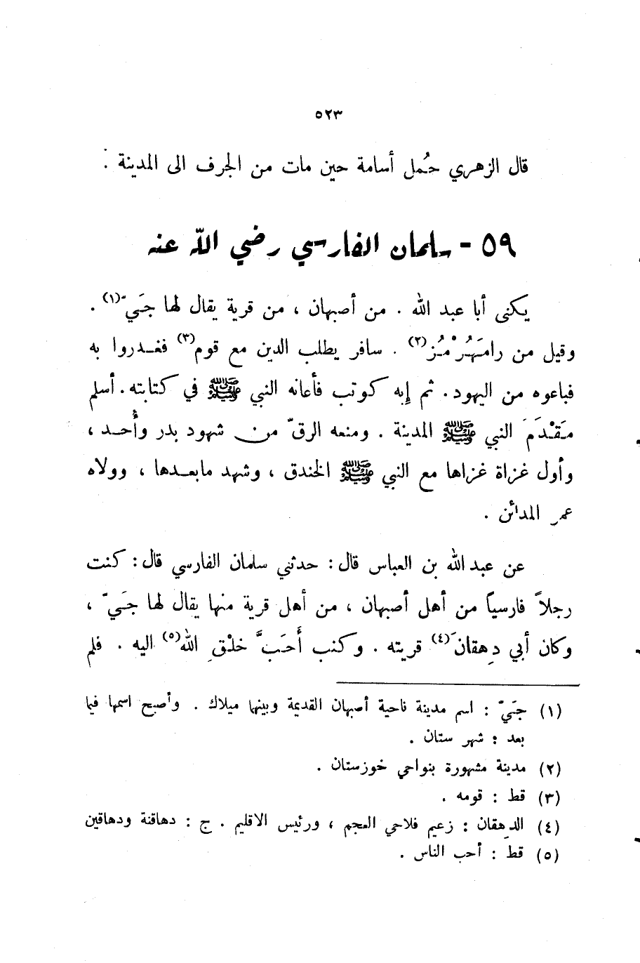 قال الزهري حمل أسامة حين مات من الجرف إلى المدينة 59 سلمان الفارسي رضي الله عنه