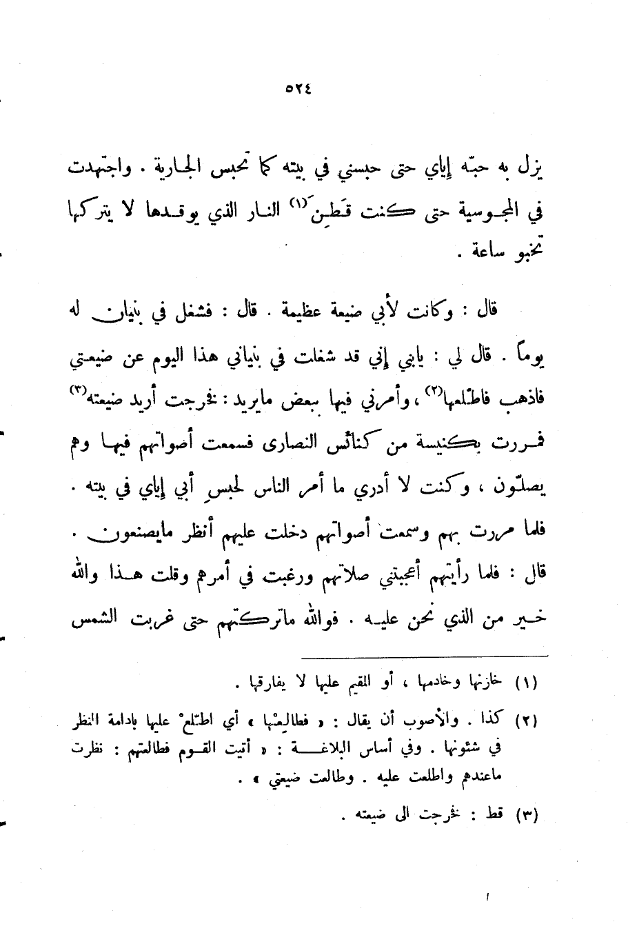 قال وكانت لأبي ضيعة عظيمة قال فشغل في بنيان له يوما قال لي يا بني إني قد شغلت في بنياني هذا اليوم عن ضيعتي فاذهب فاطلعها وأمرني فيها ببعض ما يريد فخرجت أريد ضيعته فمررت بكنيسة من كنائس النصارى فسمعت أصواتهم فيها وهم يصلون وكنت لا أدري ما أمر الناس لحبس أبي إياي في بيته فلما مررت بهم وسمعت أصواتهم دخلت عليهم أنظر ما يصنعون قال فلما رأيتهم أعجبتني صلاتهم ورغبت في أمرهم وقلت هذا والله خير من الذي نحن عليه فوالله ما تركتهم حتى غربت الشمس