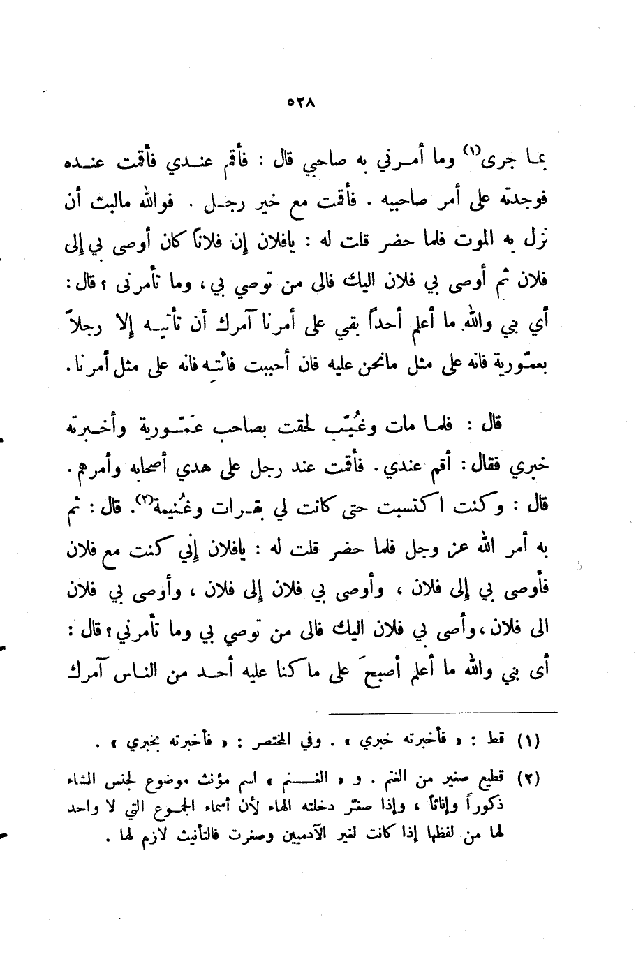 قال فلما مات وغيب لحقت بصاحب عمورية وأخبرته خبري فقال أقم عندي فأقمت عند رجل على هدي أصحابه وأمرهم قال وكنت اكتسبت حتى كانت لي بقرات وغنيمة قال ثم به أمر الله عز و جل فلما حضر قلت له يا فلان إني كنت مع فلان فأوصى بي إلى فلان وأوصى بي فلان إلى فلان وأوصى بي فلان إلى فلان وأوصى بي فلان إليك فالى من توصي بي وما تأمرني قال أي بني والله ما أعلم أصبح على ما كنا عليه أحد من الناس آمرك