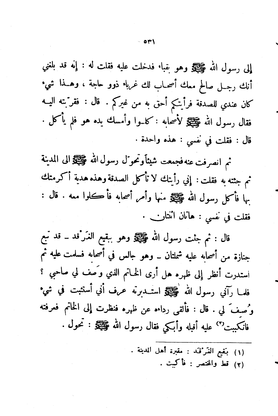 ثم انصرفت عنه فجمعت شيئا وتحول رسول الله صلى الله عليه و سلم إلى المدينة ثم جئته به فقلت إني رأيتك لا تأكل الصدقة وهذه هدية أكرمتك بها فأكل رسول الله صلى الله عليه و سلم منها وأمر أصحابه فأكلوا معه قال فقلت في نفسي هاتان اثنتان