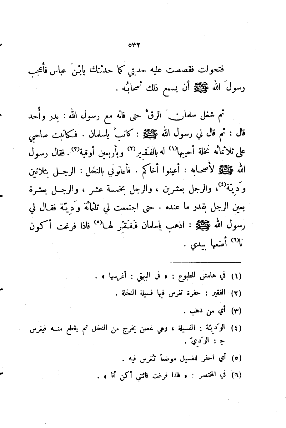 ثم شغل سلمان الرق حتى فاته مع رسول الله بدر وأحد قال ثم قال لي رسول الله صلى الله عليه و سلم كاتب يا سلمان فكاتبت صاحبي على ثلاثمائة نخلة أحييها له بالفقير وبأربعين أوقية فقال رسول الله صلى الله عليه و سلم لأصحابه أعينوا أخاكم فأعانوني بالنخل الرجل بثلاثين ودية والرجل بعشرين والرجل بخمسة عشر والرجل بعشرة بعين الرجل بقدر ما عنده حتى اجتمعت لي ثلثمائة ودية فقال لي رسول الله صلى الله عليه و سلم اذهب يا سلمان ففقر لها فإذا فرغت أكون نا أضعها بيدي