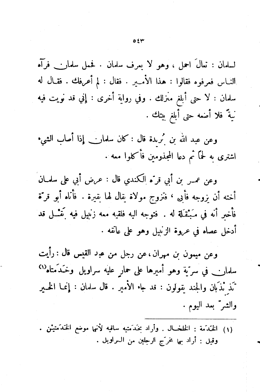 وعن ميمون بن مهران عن رجل من عبد القيس قال رأيت سلمان في سرية وهو أميرها على حمار عليه سراويل وخدمتاه تذبذبان والجند يقولون قد جاء الأمير قال سلمان إنما الخير والشر بعد اليوم
