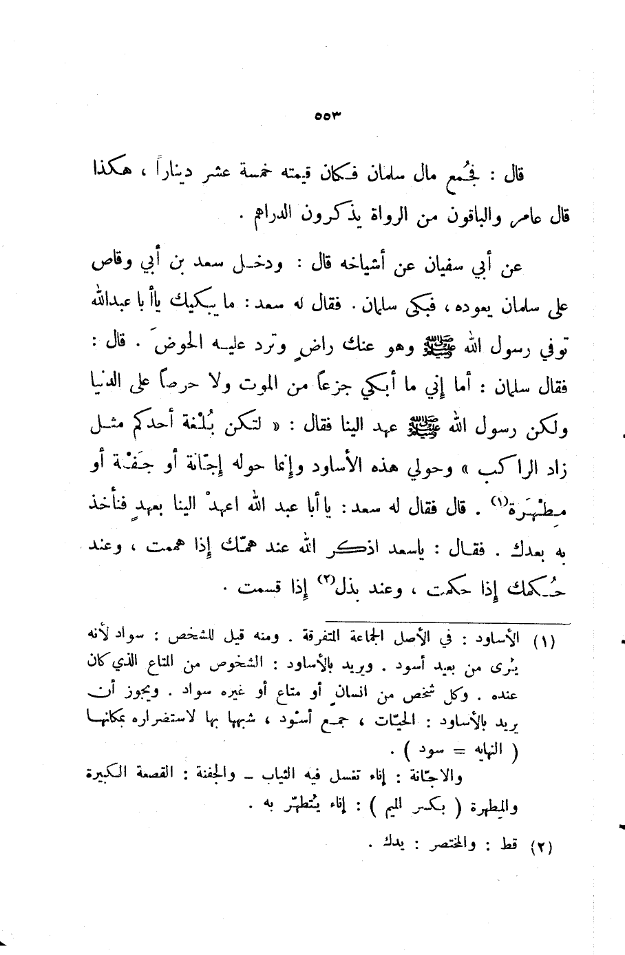 عن أبي سفيان عن أشياخه قال ودخل سعد بن أبي وقاص على سلمان يعوده فبكى سلمان فقال له سعد ما يبكيك يا أبا عبد الله توفي رسول الله صلى الله عليه و سلم وهو عنك راض وترد عليه الحوض قال فقال سلمان أما إني ما أبكي جزعا من الموت ولا حرصا على الدنيا ولكن رسول الله صلى الله عليه و سلم عهد الينا فقال لتكن بلغة أحدكم مثل زاد الراكب وحولي هذه الأساود وإنما حوله إجانة أو جفة أو مطهرة قال فقال له سعد يا أبا عبد الله اعهد الينا بعهد فنأخذ به بعدك فقال يا سعد اذكر الله عند همك إذا هممت وعند حكمك إذا حكمت وعند بذل إذا قسمت