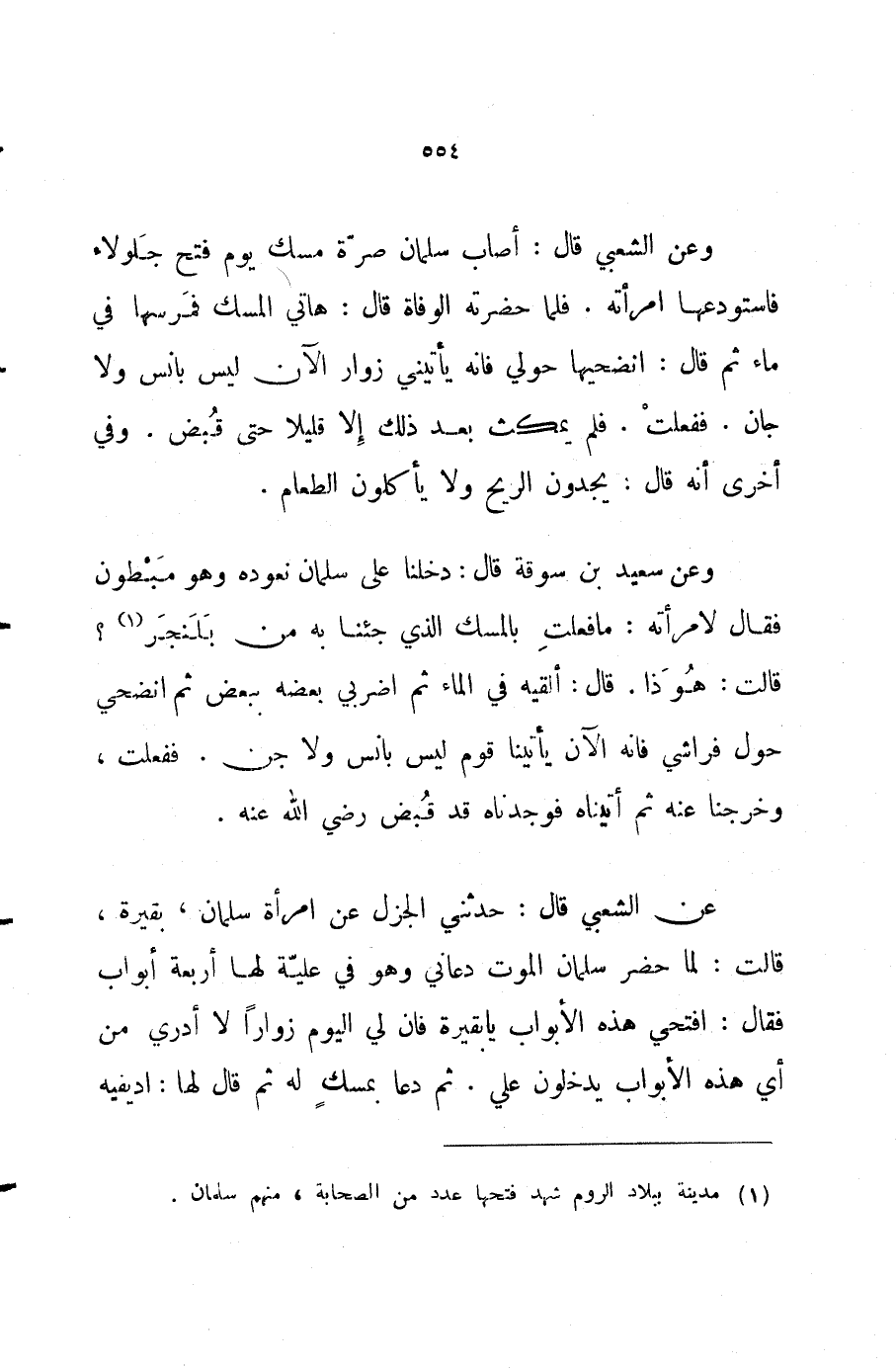 وعن سعيد بن سوقة قال دخلنا على سلمان نعوده وهو مبطون فقال لامرأته ما فعلت بالمسك الذي جئنا به من بلنجر قالت هو ذا قال ألقيه في الماء ثم اضربي بعضه ببعض ثم انضحي حول فراشي فانه الآن يأتينا قوم ليس بانس ولا جن ففعلت وخرجنا عنه ثم أتيناه فوجدناه قد قبض رضي الله عنه