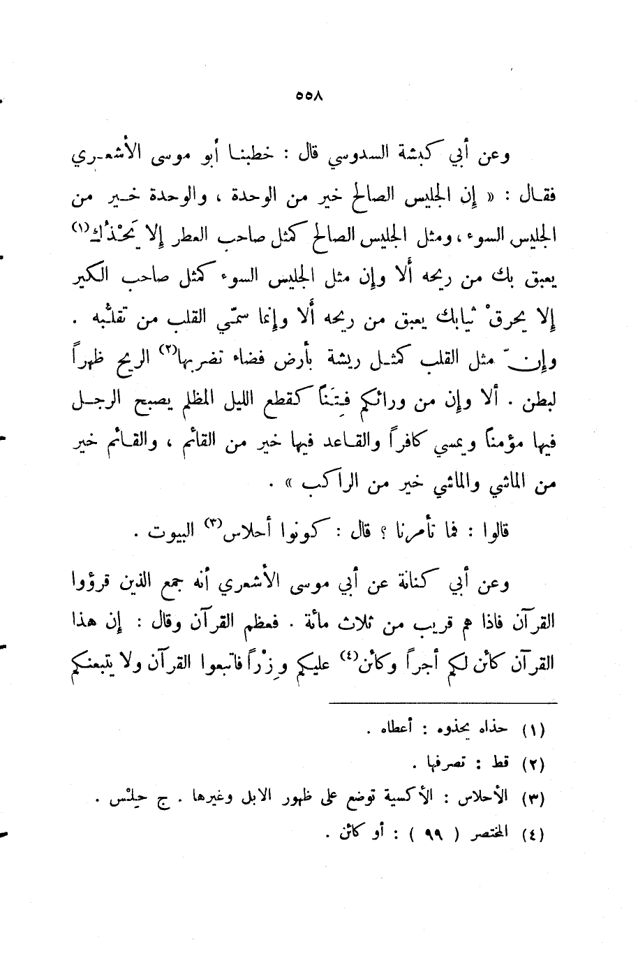 وعن أبي كبشة السدوسي قال خطبنا أبو موسى الأشعري فقال إن الجليس الصالح خير من الوحدة والوحدة خير من الجليس السوء ومثل الجليس الصالح كمثل صاحب العطر إلا يحذك يعبق بك من ريحه ألا وإن مثل الجليس السوء كمثل صاحب الكير إلا يحرق ثيابك يعبق من ريحه ألا وإنما سمي القلب من تقلبه وإن مثل القلب كمثل ريشة بأرض فضاء تضربها الريح ظهرا لبطن ألا وإن من ورائكم فتنا كقطع الليل المظلم يصبح الرجل فيها مؤمنا ويمسي كافرا والقاعد فيها خير من القائم والقائم خير من الماشي والماشي خير من الراكب