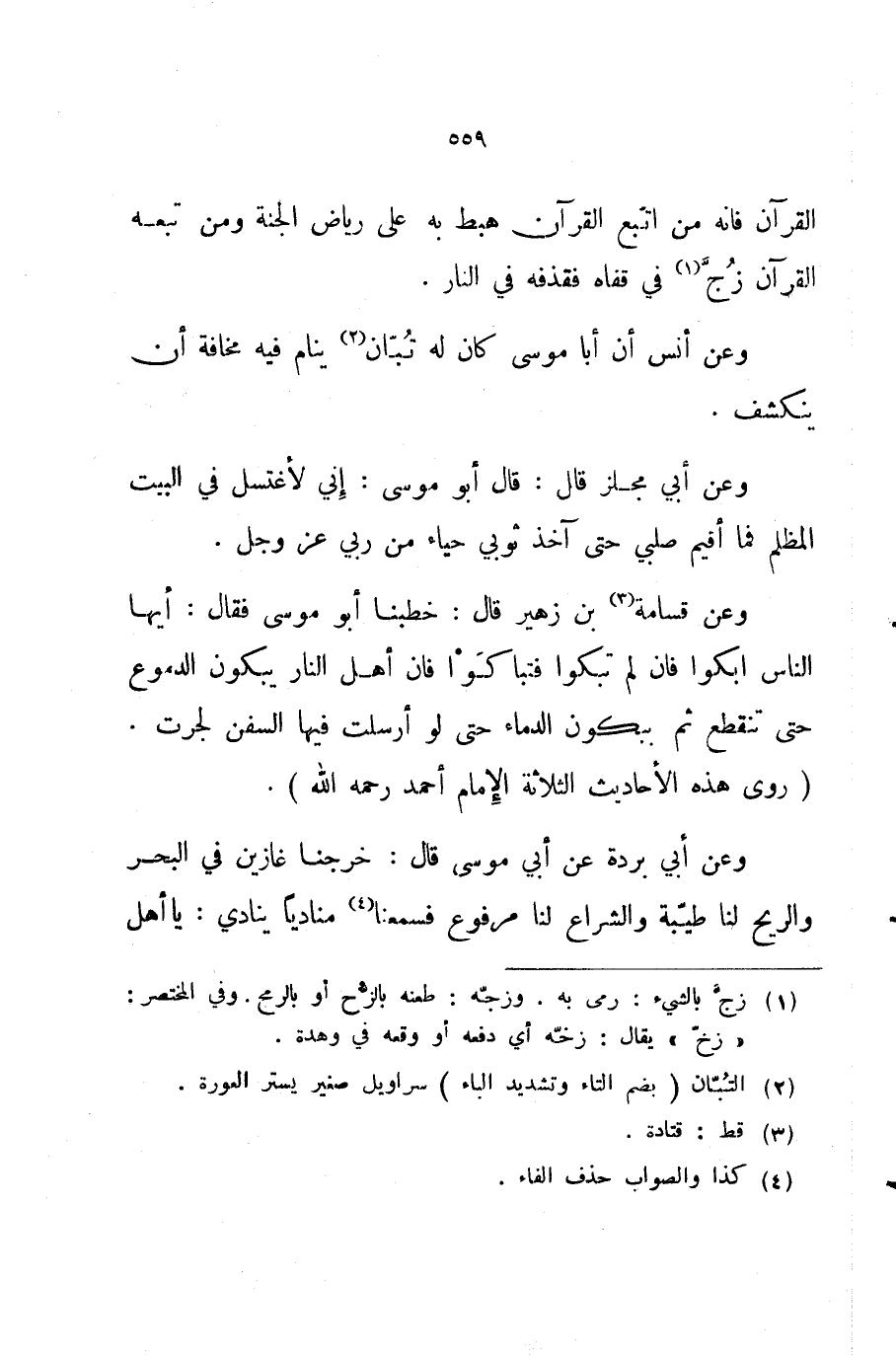 وعن قسامة بن زهير قال خطبنا أبو موسى فقال أيها الناس ابكوا فان لم تبكوا فتباكوا فان أهل النار يبكون الدموع حتى تنقطع ثم يبكون الدماء حتى لو أرسلت فيها السفن لجرت روى هذه الأحاديث الثلاثة الإمام أحمد رحمه الله