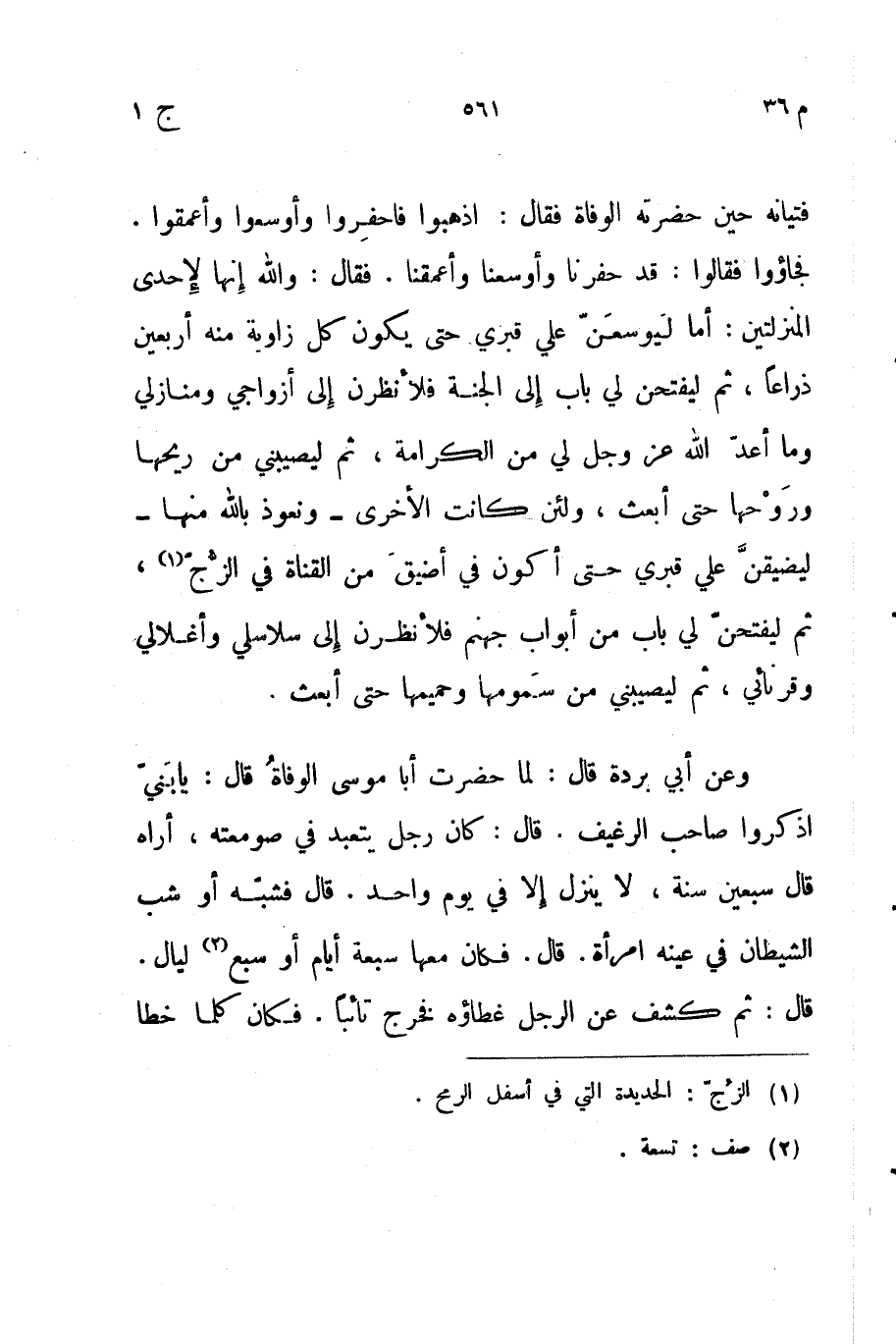 فجاؤوا فقالوا قد حفرنا وأوسعنا وأعمقنا فقال والله إنها لإحدى المنزلتين أما ليوسعن علي قبري حتى يكون كل زاوية منه أربعين ذراعا ثم ليفتحن لي باب إلى الجنة فلأنظرن إلى أزواجي ومنازلي وما أعد الله عز و جل لي من الكرامة ثم ليصيبني من ريحها وروحها حتى أبعث ولئن كانت الأخرى ونعوذ بالله منها ليضيقن علي قبري حتى أكون في أضيق من القناة في الزج ثم ليفتحن لي باب من أبواب جهنم فلأنظرن إلى سلاسلي وأغلالي وقرنائي ثم ليصيبني من سمومها وحميمها حتى أبعث