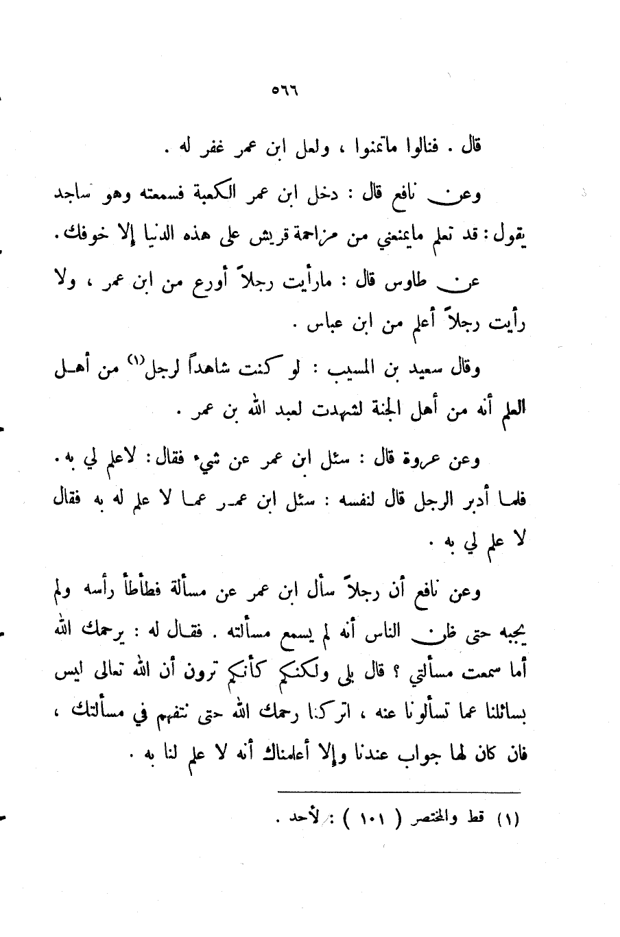 وعن عروة قال سئل ابن عمر عن شيء فقال لا علم لي به فلما أدبر الرجل قال لنفسه سئل ابن عمر عما لا علم له به فقال لا علم لي به