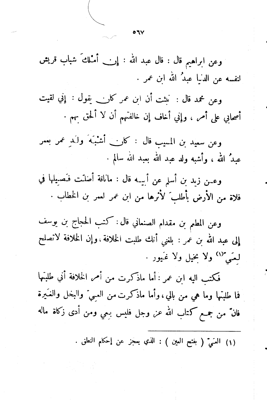 وعن المطعم بن مقدام الصنعاني قال كتب الحجاج بن يوسف إلى عبد الله بن عمر بلغني أنك طلبت الخلافة وإن الخلافة لا تصلح لعي ولا بخيل ولا غيور
