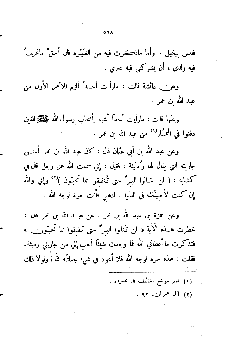 وعن عبد الله بن أبي عثمان قال كان عبد الله بن عمر أعتق جاريته التي يقال لها رميثة فقيل إني سمعت الله عز و جل قال في كتابه لن تنالوا البر حتى تنفقوا مما تحبون وإني والله إن كنت لأحبك في الدنيا اذهبي فأنت حرة لوجه الله