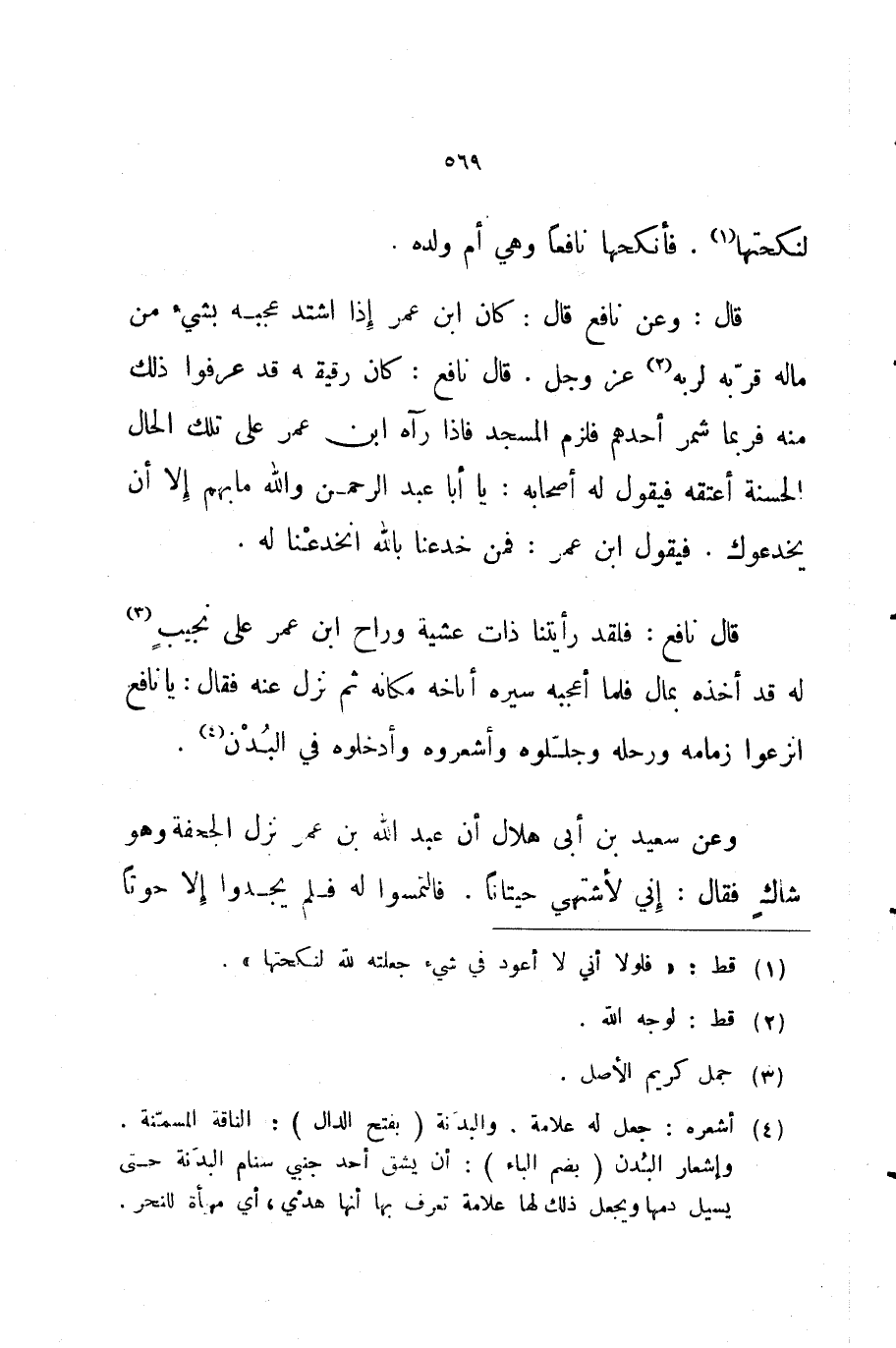 قال نافع فلقد رأيتنا ذات عشية وراح ابن عمر على نجيب له قد أخذه بمال فلما أعجبه سيره أباخه مكانه ثم نزل عنه فقال يا نافع انزعوا زمامه ورحله وجللوه وأشعروه وأدخلوه في البدن