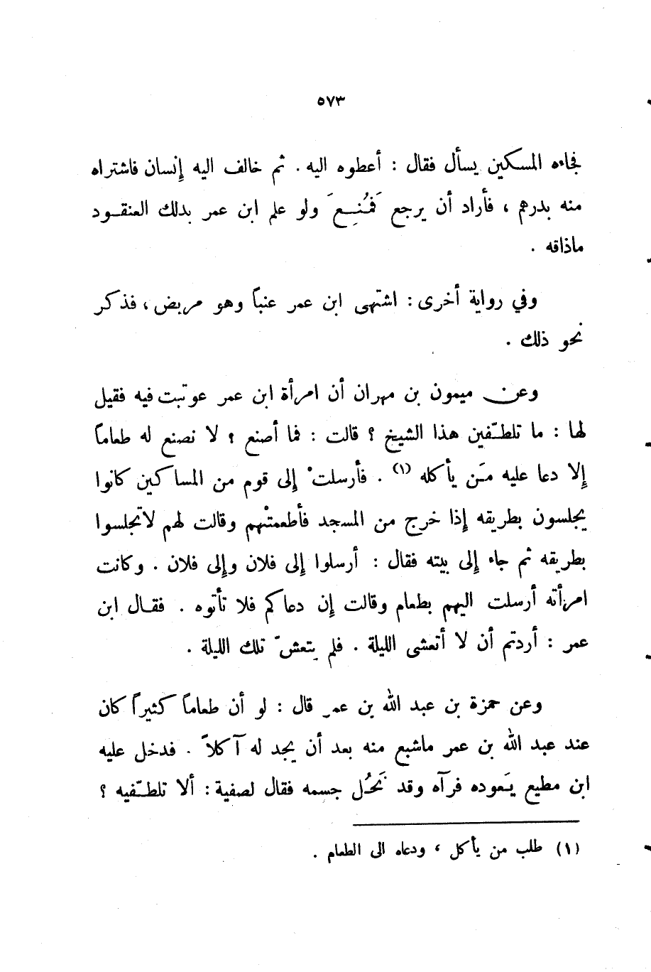 وعن حمزة بن عبد الله بن عمر قال لو أن طعاما كثيرا كان عند عبد الله بن عمر ما شبع منه بعد أن يجد له آكلا فدخل عليه ابن مطيع يعوده فرآه وقد نحل جسمه فقال لصفية ألا تلطفيه