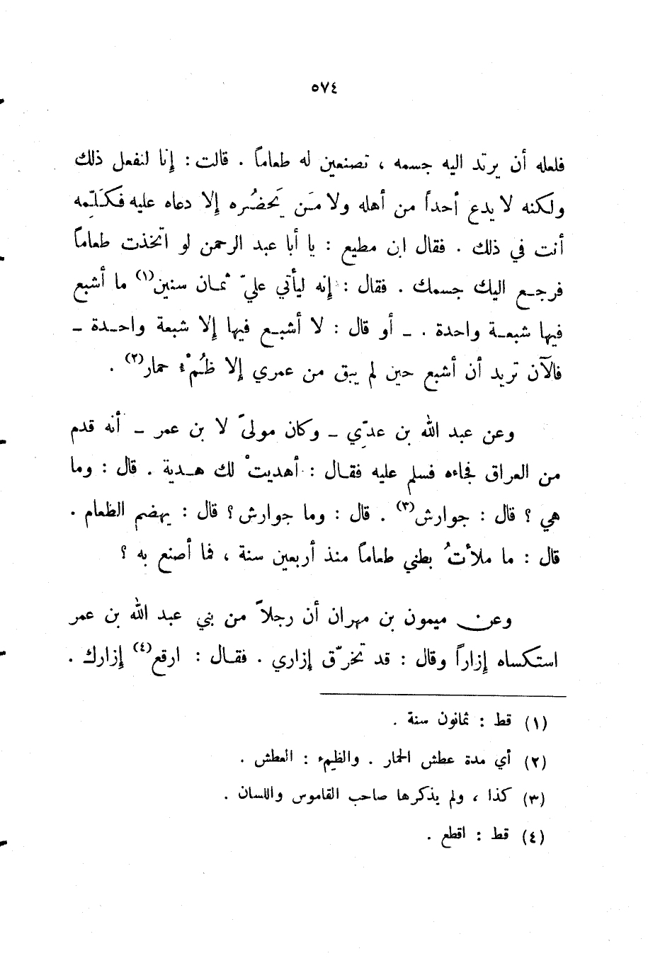 وعن عبد الله بن عدي وكان مولى لابن عمر أنه قدم من العراق فجاءه فسلم عليه فقال أهديت لك هدية قال وما هي قال جوارش قال وما جوارش قال يهضم الطعام
