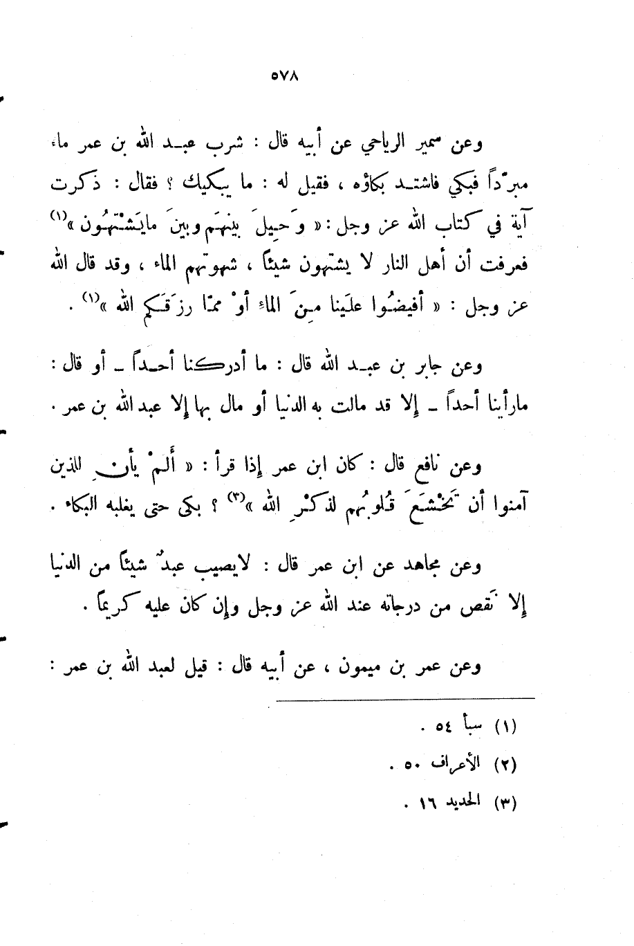 وعن سمير الرياحي عن أبيه قال شرب عبد الله بن عمر ماء مبردا فبكي فاشتد بكاؤه فقيل له ما يبكيك فقال ذكرت آية في كتاب الله عز و جل وحيل بينهم وبين ما يشتهون فعرفت أن أهل النار لا يشتهون شيئا شهوتهم الماء وقد قال الله عز و جل أفيضوا علينا من الماء أو مما رزقكم الله