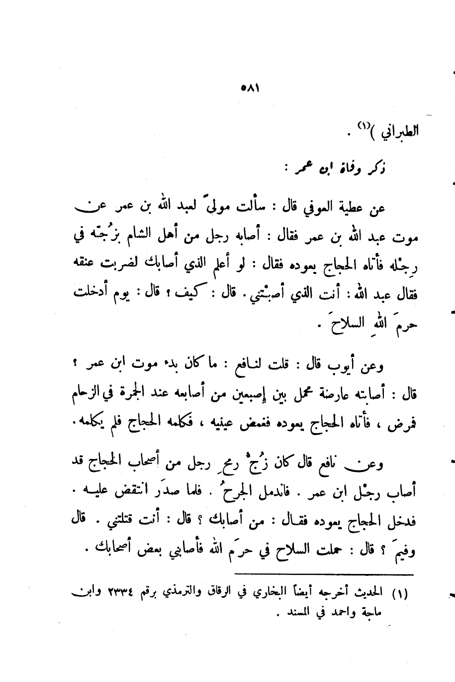 عن عطية العوفي قال سألت مولى لعبد الله بن عمر عن موت عبد الله بن عمر فقال أصابه رجل من أهل الشام بزجه في رجله فأتاه الحجاج يعوده فقال لو أعلم الذي أصابك لضربت عنقه فقال عبد الله أنت الذي أصبتني قال كيف قال يوم أدخلت حرم الله السلاح