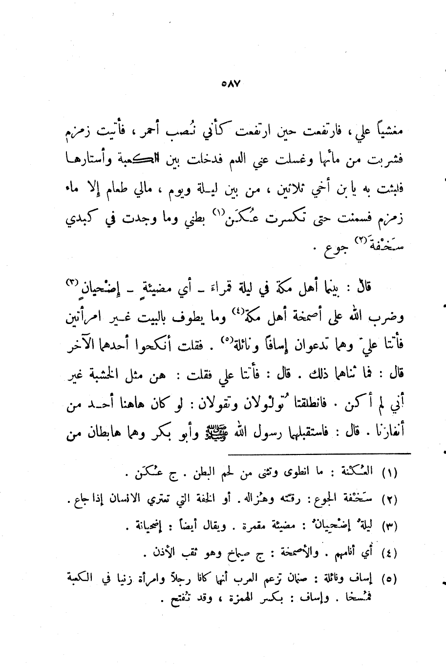 مغشيا علي فارتفعت حين ارتفعت كأني نصب أحمر فأتيت زمزم فشربت من مائها وغسلت عني الدم فدخلت بين الكعبة وأستارها فلبثت به يا بن أخي ثلاثين من بين ليلة ويوم ما لي طعام إلا ماء زمزم فسمنت حتى تكسرت عكن بطني وما وجدت في كبدي سخفة جوع