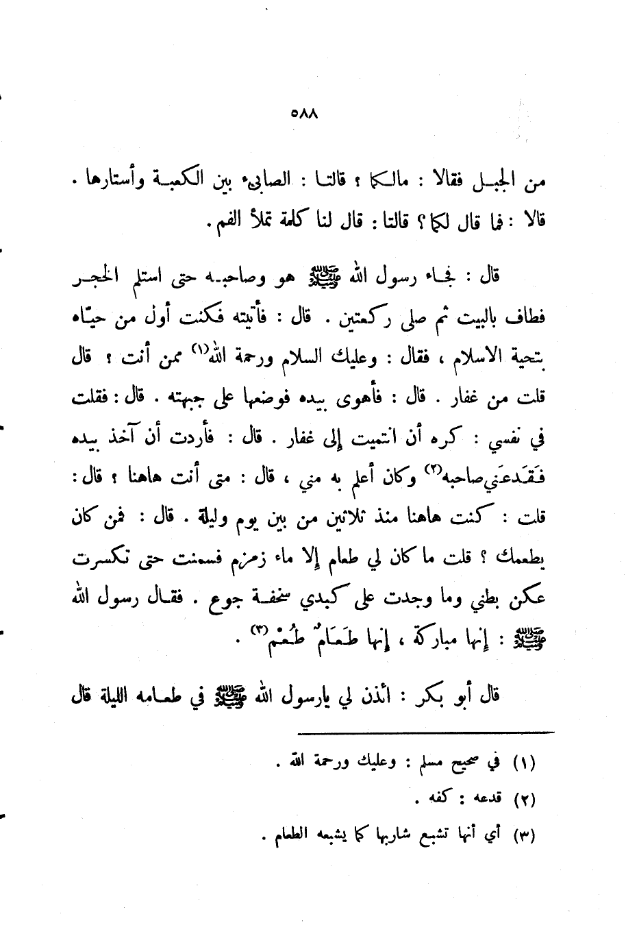 قال فجاء رسول الله صلى الله عليه و سلم هو وصاحبه حتى استلم الحجر فطاف بالبيت ثم صلى ركعتين قال فأتيته فكنت أول من حياه بتحية الإسلام فقال وعليك السلام ورحمة الله ممن أنت قال قلت من غفار قال فأهوى بيده فوضعها على جبهته قال فقلت في نفسي كره أن انتميت إلى غفار قال فأردت أن آخذ بيده فقدعني صاحبه وكان أعلم به مني قال متى أنت ها هنا قال قلت كنت ها هنا منذ ثلاثين من بين يوم وليلة قال فمن كان يطعمك قلت ما كان لي طعام إلا ماء زمزم فسمنت حتى تكسرت عكن بطني وما وجدت على كبدي سخفة جوع فقال رسول الله صلى الله عليه و سلم إنها مباركة إنها طعام طعم