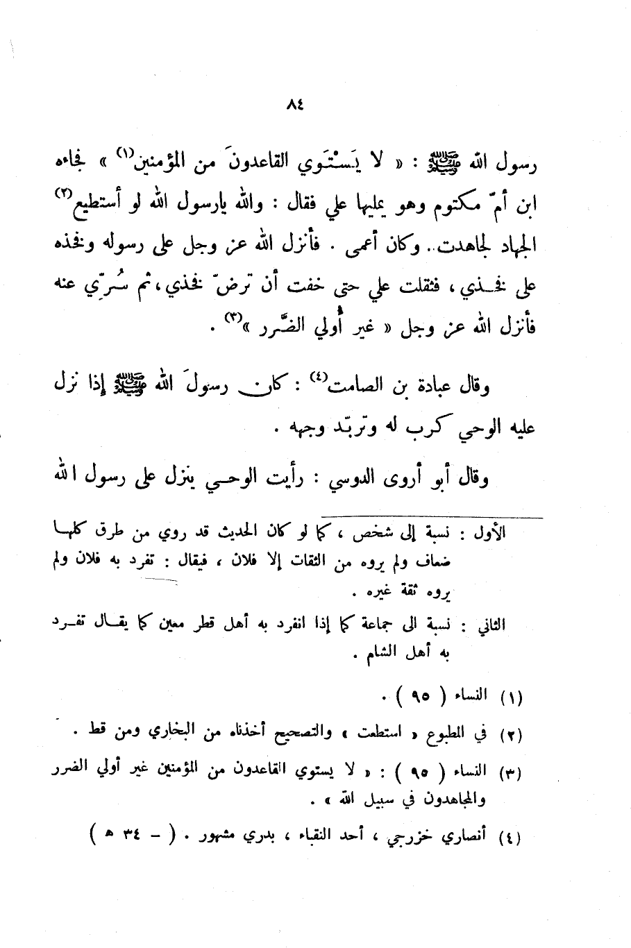 رسول الله صلى الله عليه و سلم لا يستوي القاعدون من المؤمنين فجاءه ابن أم مكتوم وهو يمليها علي فقال والله يا رسول الله لو أستطيع الجهاد لجاهدت وكان أعمى فأنزل الله عز و جل على رسوله وفخذه على فخذي فثقلت علي حتى خفت أن ترض فخذي ثم سري عنه فأنزل الله عز و جل غير أولي الضرر