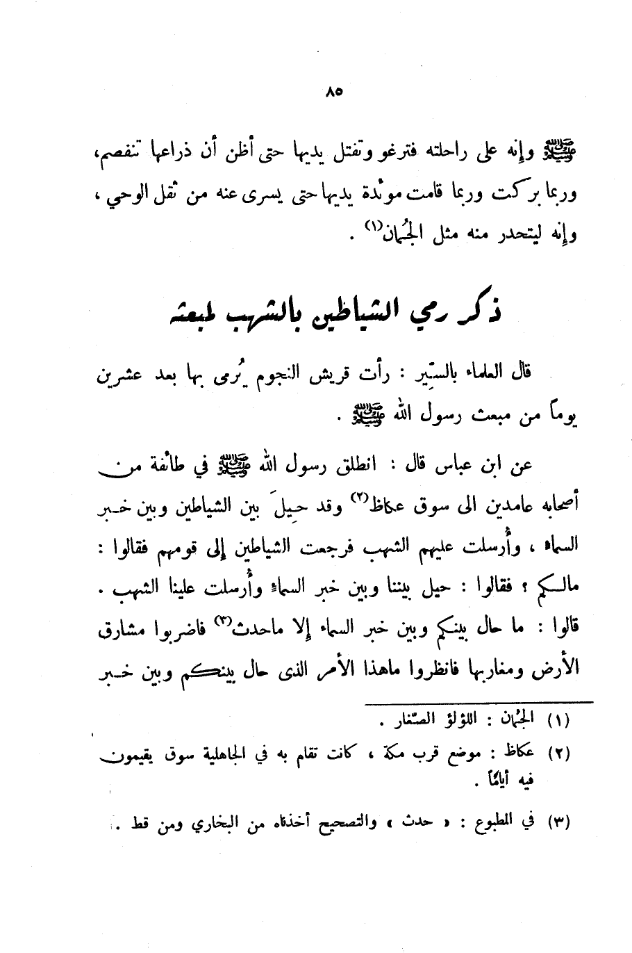 عن ابن عباس قال انطلق رسول الله صلى الله عليه و سلم في طائفة من أصحابه عامدين إلى سوق عكاظ وقد حيل بين الشياطين وبين خبر السماء وأرسلت عليهم الشهب فرجعت الشياطين إلى قومهم فقالوا مالكم فقالوا حيل بيننا وبين خبر السماء وأرسلت علينا الشهب قالوا ما حال بينكم وبين خبر السماء إلا ما حدث فاضربوا مشارق الأرض ومغاربها فانظروا ما هذا الأمر الذي حال بينكم وبين خبر