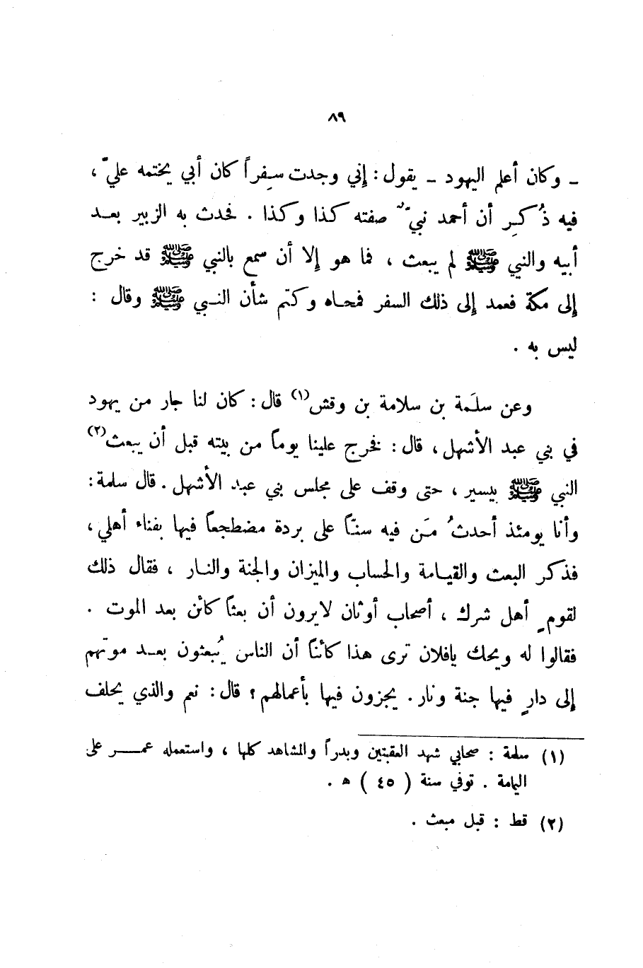 وعن سلمة بن سلامة بن وقش قال كان لنا جار من يهود في بني الأشهل قال فخرج علينا يوما من بيته قبل أن يبعث النبي صلى الله عليه و سلم بيسير حتى وقف على مجلس بني عبد الأشهل قال سلمة وأنا يومئذ أحدث من فيه سنا على بردة مضطجعا فيها بفناء أهلي فذكر البعث والقيامة والحساب والميزان والجنة والنار فقال ذلك لقوم أهل شرك أصحاب أوثان لايرون أن بعثا كائن بعد الموت فقالوا له ويحك يا فلان ترى هذا كائنا أن الناس يبعثون بعد موتهم إلى دار فيها جنة ونار يجزون فيها بأعمالهم قال نعم والذي يحلف