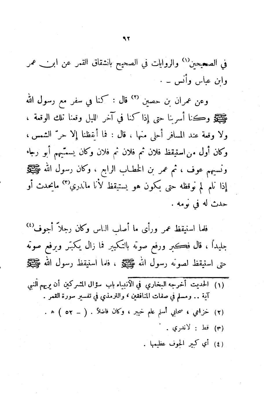 وعن عمران بن حصين قال كنا في سفر مع رسول الله صلى الله عليه و سلم وكنا أسرينا حتى إذا كنا في آخر الليل وقعنا تلك الوقعة ولا وقعة عند المسافر أحلى منها قال فما أيقظنا إلا حر الشمس وكان أول من استيقظ فلان ثم فلان ثم فلان وكان يسميهم أبو رجاء ونسيهم عوف ثم عمر بن الخطاب الرابع وكان رسول الله صلى الله عليه و سلم إذا نام لم نوقظه حتى يكون هو يستيقظ لأنا ما ندري ما يحدث أو حدث له في نومه