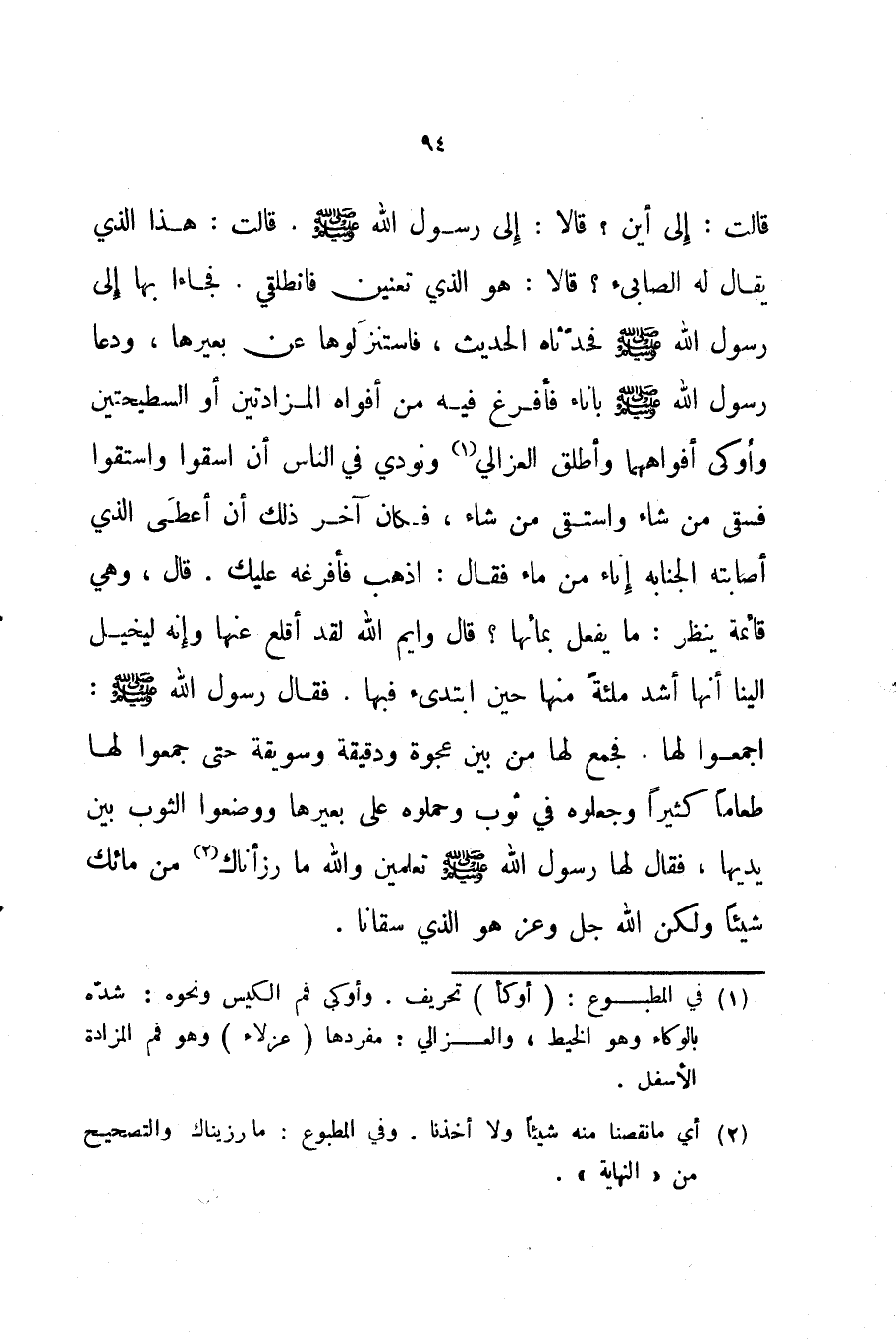 قالت إلى أين قالا إلى رسول الله صلى الله عليه و سلم قالت هذا الذي يقال له الصابىء قالا هو الذي تعنين فانطلقي فجاءا بها إلى رسول الله صلى الله عليه و سلم فحدثاه الحديث فاستنزلوها عن بعيرها ودعا رسول الله صلى الله عليه و سلم بإناء فأفرغ فيه من أفواه المزادتين أو السطيحتين وأوكى أفواههما وعلق العزالي ونودي في الناس أن اسقوا واستقوا فسقى من شاء واستقى من شاء فكان آخر ذلك أن أعطى الذي أصابته الجنابة إناء من ماء فقال اذهب فأفرغه عليك قال وهي قائمة ينظر ما يفعل بمائها قال وايم الله لقد أقلع عنها وإنه ليخيل إلينا أنها أشد ملئة منها حين إبتدىء فيها فقال رسول الله صلى الله عليه و سلم اجمعوا لها فجمع لها من بين عجوة ودقيقة وسويقة حتى جمعوا لها طعاما كثيرا وجعلوه في ثوب وحملوه على بعيرها ووضعوا الثوب بين يديها فقال لها رسول الله صلى الله عليه و سلم تعلمين والله ما رزأناك من مائك شيئا ولكن الله جل وعز هو الذي سقانا