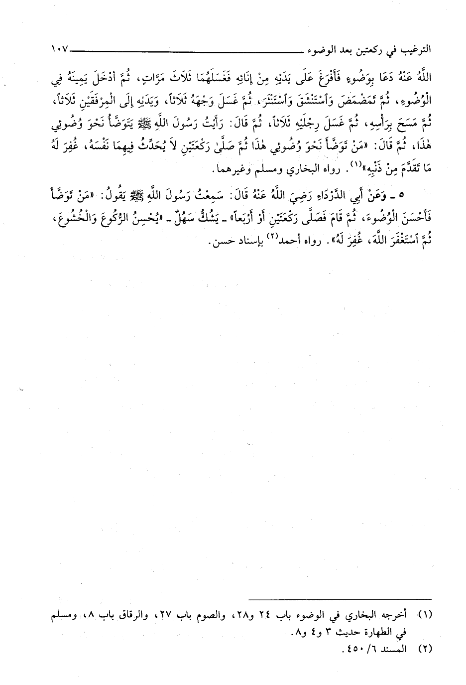 357 - وَعَن أبي الدَّرْدَاء رَضِي الله عَنهُ قَالَ سَمِعت رَسُول الله صلى الله عَلَيْهِ وَسلم يَقُول من تَوَضَّأ فَأحْسن الْوضُوء ثمَّ قَامَ فصلى رَكْعَتَيْنِ أَو أَرْبعا يشك سهل يحسن الرُّكُوع والخشوع ثمَّ اسْتغْفر الله غفر لَهُ