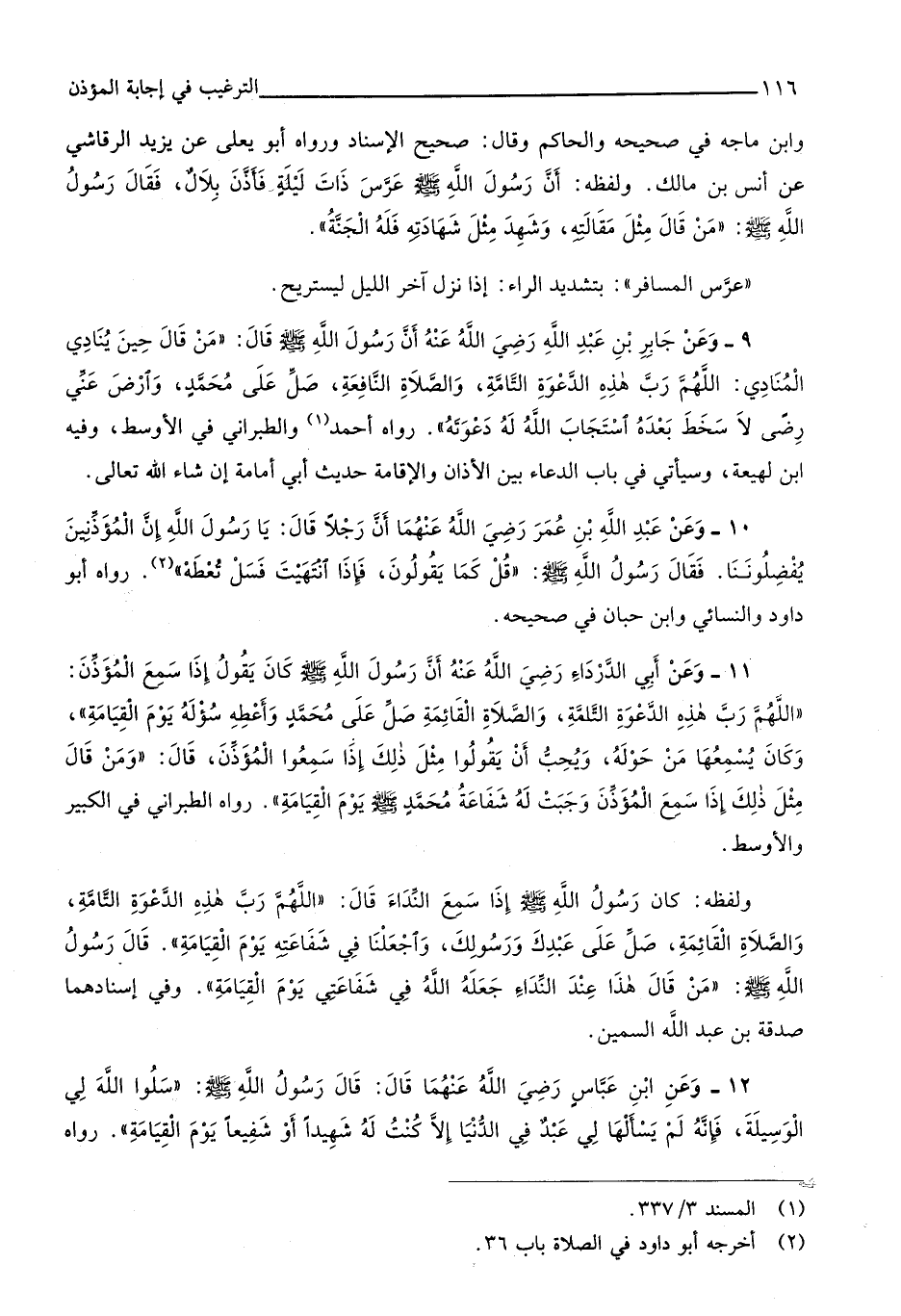 398 - وَعَن أبي الدَّرْدَاء رَضِي الله عَنهُ أَن رَسُول الله صلى الله عَلَيْهِ وَسلم كَانَ يَقُول إِذا سمع الْمُؤَذّن اللَّهُمَّ رب هَذِه الدعْوَة التَّامَّة وَالصَّلَاة الْقَائِمَة صل على مُحَمَّد وأعطه سؤله يَوْم الْقِيَامَة وَكَانَ يسْمعهَا من حوله وَيُحب أَن يَقُولُوا مثل ذَلِك إِذا سمعُوا الْمُؤَذّن قَالَ وَمن قَالَ مثل ذَلِك إِذا سمع الْمُؤَذّن وَجَبت لَهُ شَفَاعَة مُحَمَّد صلى الله عَلَيْهِ وَسلم يَوْم الْقِيَامَة