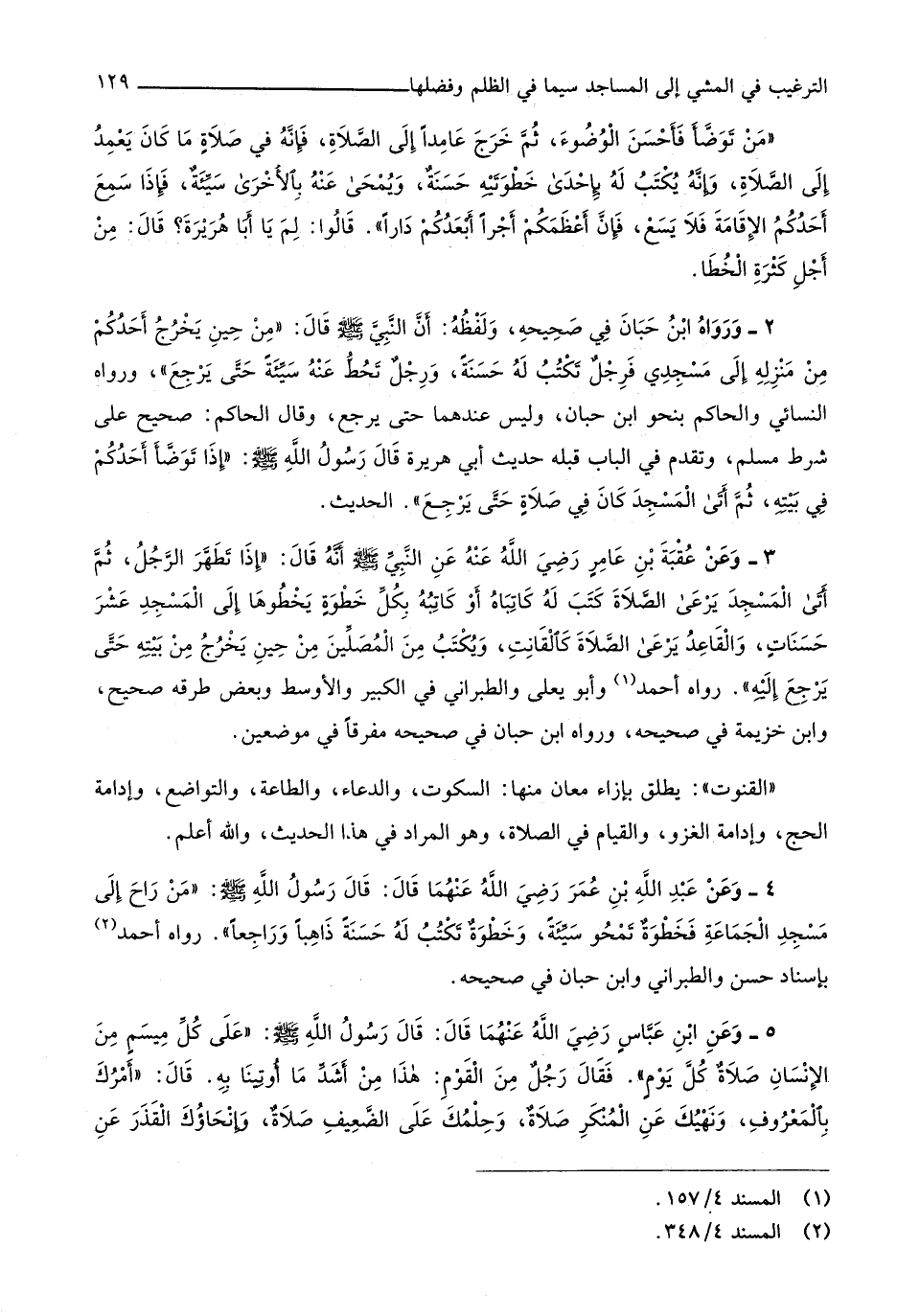 458 - وَرَوَاهُ ابْن حبَان فِي صَحِيحه وَلَفظه أَن النَّبِي صلى الله عَلَيْهِ وَسلم قَالَ من حِين يخرج أحدكُم من منزله إِلَى مَسْجِدي فَرجل تكْتب لَهُ حَسَنَة وَرجل تحط عَنهُ سَيِّئَة حَتَّى يرجع وَرَوَاهُ النَّسَائِيّ وَالْحَاكِم بِنَحْوِ ابْن حبَان وَلَيْسَ عِنْدهمَا حَتَّى يرجع وَقَالَ الْحَاكِم صَحِيح على شَرط مُسلم وَتقدم فِي الْبَاب قبله حَدِيث أبي هُرَيْرَة قَالَ رَسُول الله صلى الله عَلَيْهِ وَسلم إِذا تَوَضَّأ أحدكُم فِي بَيته ثمَّ أَتَى الْمَسْجِد كَانَ فِي صَلَاة حَتَّى يرجع
