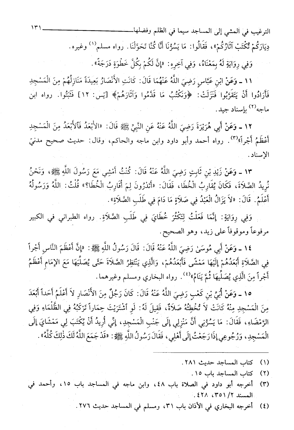 471 - وَعَن أبي بن كَعْب رَضِي الله عَنهُ قَالَ كَانَ رجل من الْأَنْصَار لَا أعلم أحدا أبعد من الْمَسْجِد مِنْهُ كَانَت لَا تخطئه صَلَاة فَقيل لَهُ لَو اشْتريت حمارا تركبه فِي الظلماء وَفِي الرمضاء فَقَالَ مَا يسرني أَن منزلي إِلَى جنب الْمَسْجِد إِنِّي أُرِيد أَن يكْتب لي ممشاي إِلَى الْمَسْجِد ورجوعي إِذا رجعت إِلَى أَهلِي فَقَالَ رَسُول الله صلى الله عَلَيْهِ وَسلم قد جمع الله لَك ذَلِك كُله