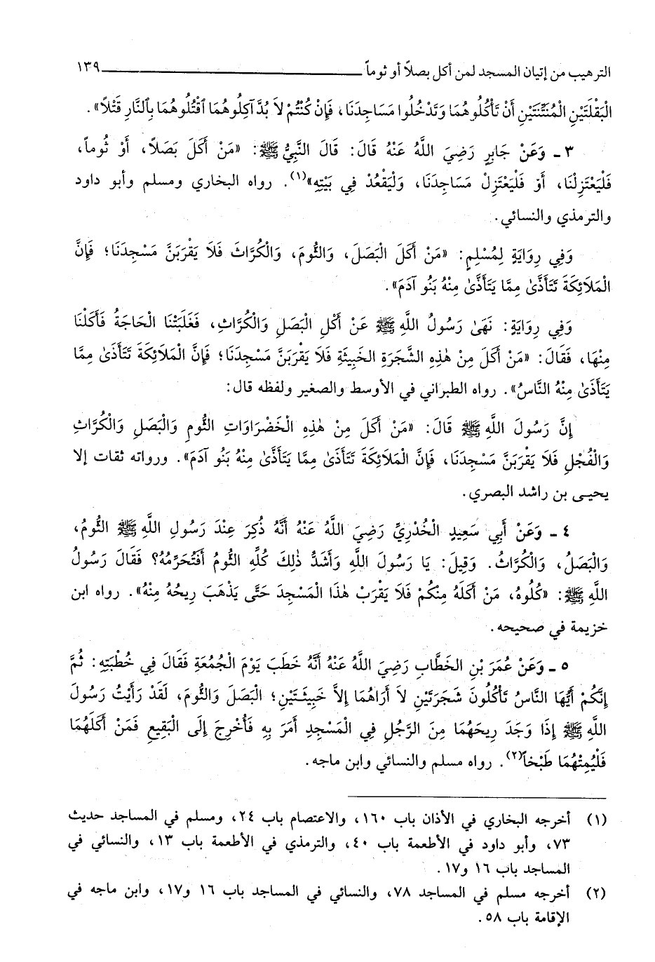 رَوَاهُ الطَّبَرَانِيّ فِي الْأَوْسَط وَالصَّغِير وَلَفظه قَالَ إِن رَسُول الله صلى الله عَلَيْهِ وَسلم قَالَ من أكل من هَذِه الخضراوات الثوم والبصل والكراث والفجل فَلَا يقربن مَسْجِدنَا فَإِن الْمَلَائِكَة تتأذى مِمَّا يتَأَذَّى مِنْهُ بَنو آدم