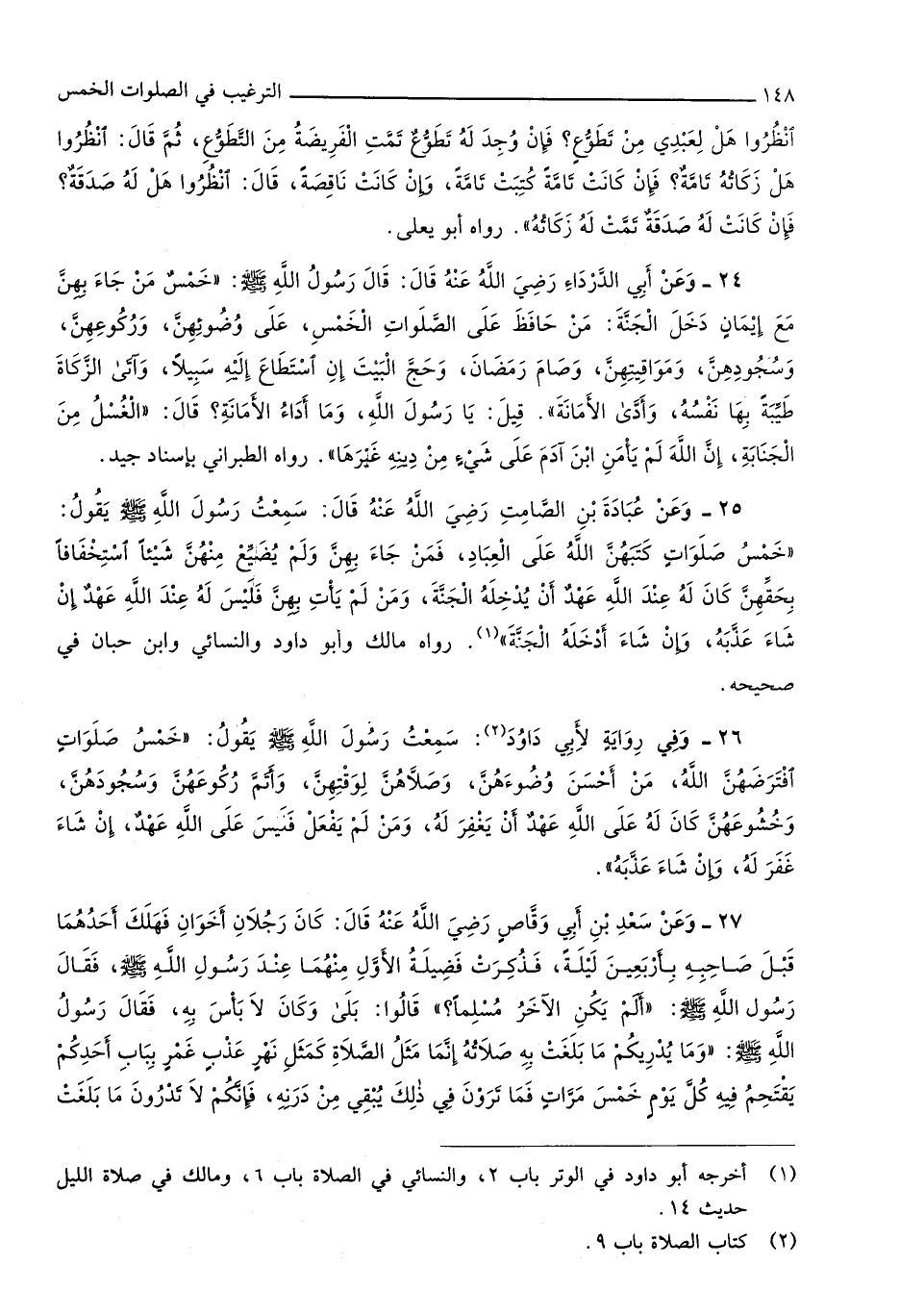 546 - وَفِي رِوَايَة لابي دَاوُد سَمِعت رَسُول الله صلى الله عَلَيْهِ وَسلم يَقُول خمس صلوَات افترضهن الله من أحسن وضوءهن وصلاهن لوقتهن وَأتم ركوعهن وسجودهن وخشوعهن كَانَ لَهُ على الله عهد أَن يغْفر لَهُ وَمن لم يفعل فَلَيْسَ على الله عهد إِن شَاءَ غفر لَهُ وَإِن شَاءَ عذبه