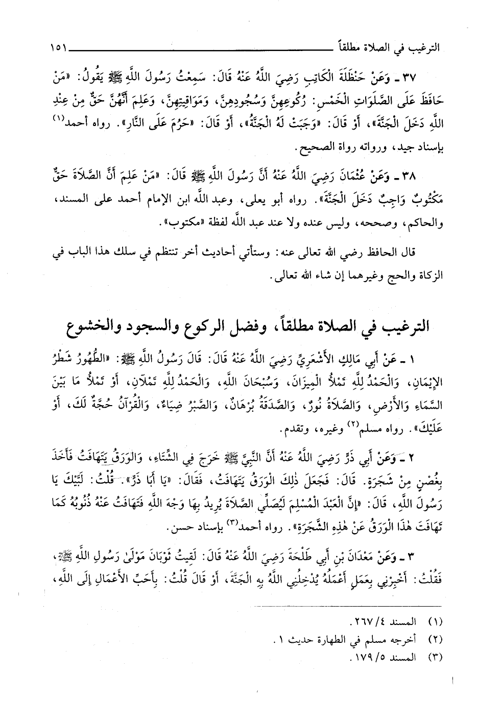 557 - وَعَن حَنْظَلَة الْكَاتِب رَضِي الله عَنهُ قَالَ سَمِعت رَسُول الله صلى الله عَلَيْهِ وَسلم يَقُول من حَافظ على الصَّلَوَات الْخمس ركوعهن وسجودهن ومواقيتهن وَعلم أَنَّهُنَّ حق من عِنْد الله دخل الْجنَّة أَو قَالَ وَجَبت لَهُ الْجنَّة أَو قَالَ حرم على النَّار
