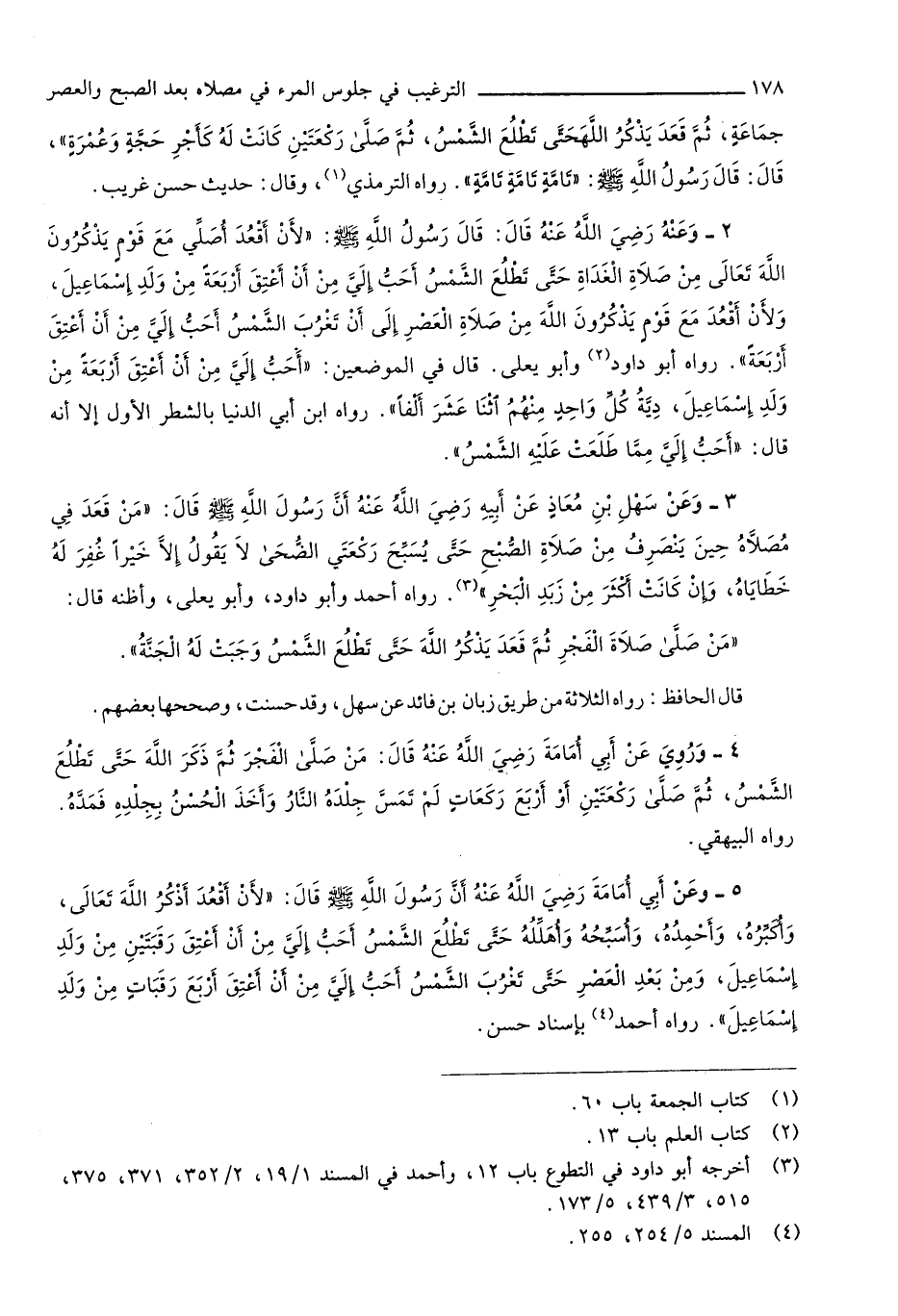 671 - وَعَن أبي أُمَامَة رَضِي الله عَنهُ أَن رَسُول الله صلى الله عَلَيْهِ وَسلم قَالَ لِأَن أقعد أذكر الله تَعَالَى وأكبره وأحمده وأسبحه وأهلله حَتَّى تطلع الشَّمْس أحب إِلَيّ من أَن أعتق رقبتين من ولد إِسْمَاعِيل وَمن بعد الْعَصْر حَتَّى تغرب الشَّمْس أحب إِلَيّ من أَن أعتق أَربع رقبات من ولد إِسْمَاعِيل