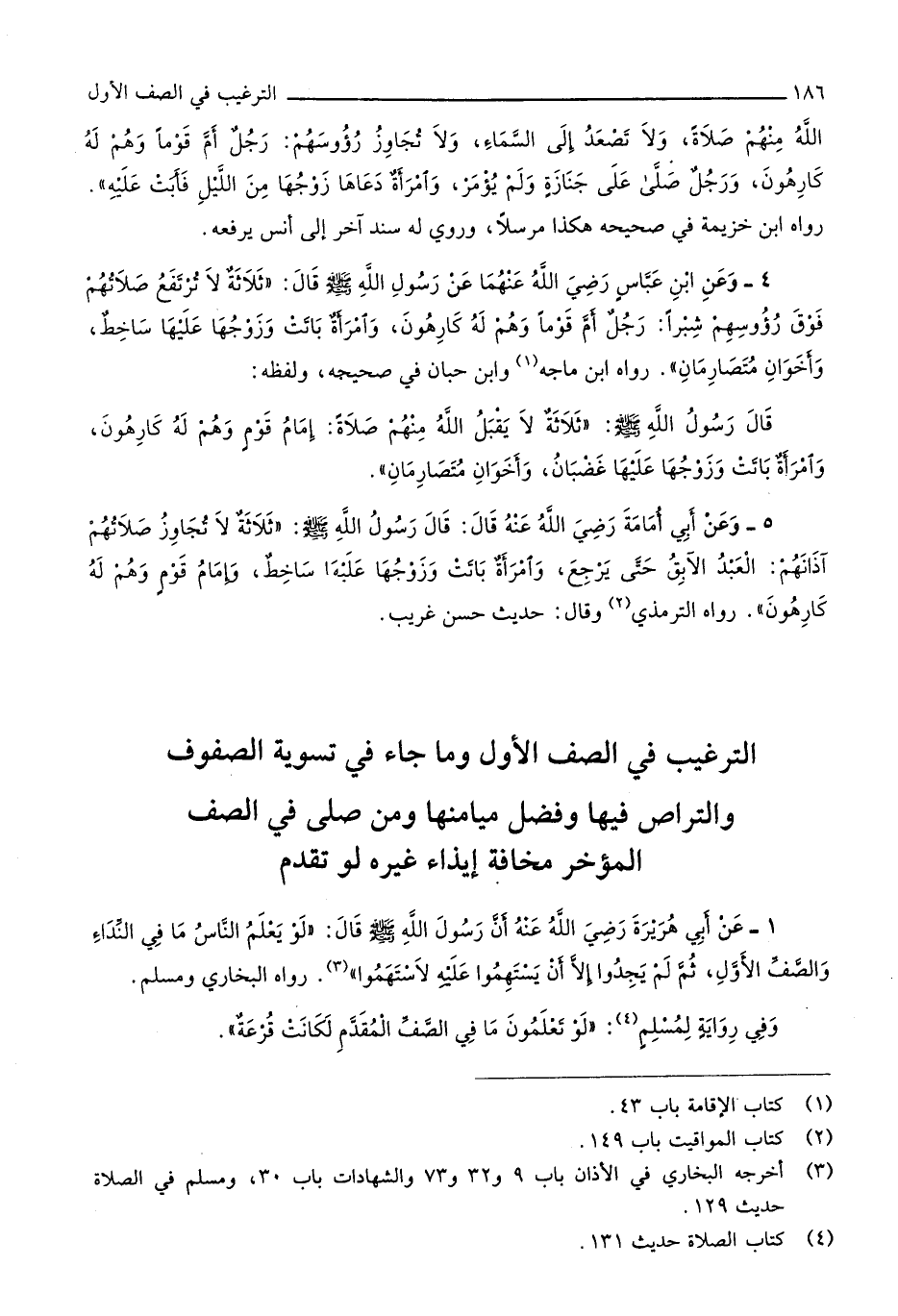 2 - التَّرْغِيب فِي الصَّفّ الأول وَمَا جَاءَ فِي تَسْوِيَة الصُّفُوف والتراص فِيهَا وَفضل ميامنها وَمن صلى فِي الصَّفّ الْمُؤخر مَخَافَة إِيذَاء غَيره لَو تقدم