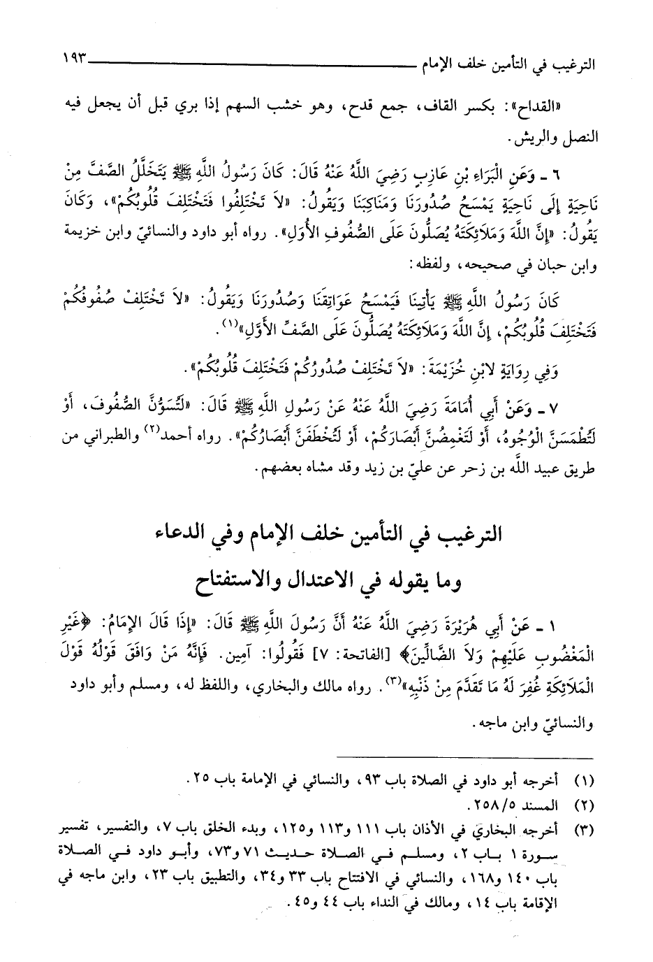 رَوَاهُ أَبُو دَاوُد وَالنَّسَائِيّ وَابْن خُزَيْمَة وَابْن حبَان فِي صَحِيحه وَلَفظه كَانَ رَسُول الله صلى الله عَلَيْهِ وَسلم يأتينا فيمسح عواتقنا وصدورنا وَيَقُول لَا تخْتَلف صفوفكم فتختلف قُلُوبكُمْ إِن الله وَمَلَائِكَته يصلونَ على الصَّفّ الأول