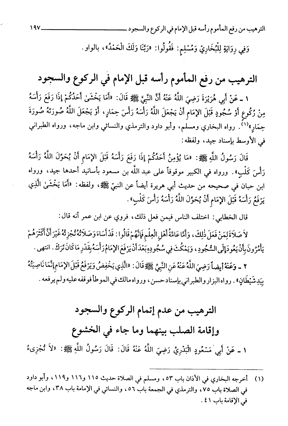 رَوَاهُ البُخَارِيّ وَمُسلم وَأَبُو دَاوُد وَالتِّرْمِذِيّ وَالنَّسَائِيّ وَابْن مَاجَه وَرَوَاهُ الطَّبَرَانِيّ فِي الْأَوْسَط بِإِسْنَاد جيد وَلَفظه قَالَ رَسُول الله صلى الله عَلَيْهِ وَسلم مَا يُؤمن أحدكُم إِذا رفع رَأسه قبل الإِمَام أَن يحول الله رَأسه رَأس كلب