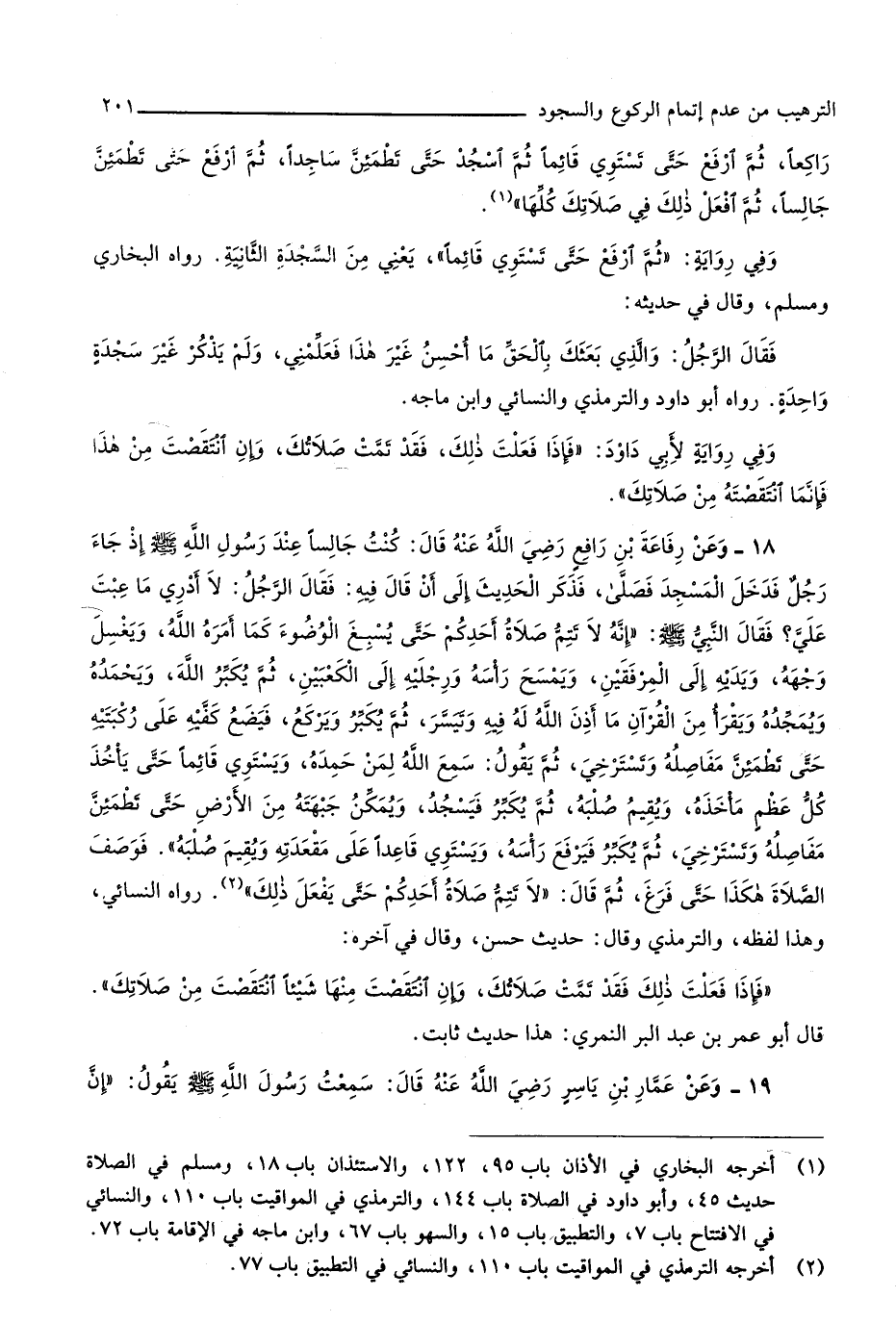 763 - وَعَن رِفَاعَة بن رَافع رَضِي الله عَنهُ قَالَ كنت جَالِسا عِنْد رَسُول الله صلى الله عَلَيْهِ وَسلم إِذْ جَاءَ رجل فَدخل الْمَسْجِد فصلى فَذكر الحَدِيث إِلَى أَن قَالَ فِيهِ فَقَالَ الرجل لَا أَدْرِي مَا عبت عَليّ فَقَالَ النَّبِي صلى الله عَلَيْهِ وَسلم إِنَّه لَا تتمّ صَلَاة أحدكُم حَتَّى يسبغ الْوضُوء كَمَا أمره الله وَيغسل وَجهه وَيَديه إِلَى الْمرْفقين وَيمْسَح رَأسه وَرجلَيْهِ إِلَى الْكَعْبَيْنِ ثمَّ يكبر الله وَيَحْمَدهُ ويمجده وَيقْرَأ من الْقُرْآن مَا أذن الله لَهُ فِيهِ وتيسر ثمَّ يكبر ويركع فَيَضَع كفيه على رُكْبَتَيْهِ حَتَّى تطمئِن مفاصله وَتَسْتَرْخِي ثمَّ يَقُول سمع الله لمن حَمده وَيَسْتَوِي قَائِما حَتَّى يَأْخُذ كل عظم مأخذه وَيُقِيم صلبه ثمَّ يكبر فَيسْجد وَيُمكن جَبهته من الأَرْض حَتَّى تطمئِن مفاصله وَتَسْتَرْخِي ثمَّ يكبر فيرفع رَأسه وَيَسْتَوِي قَاعِدا على مقعدته وَيُقِيم صلبه