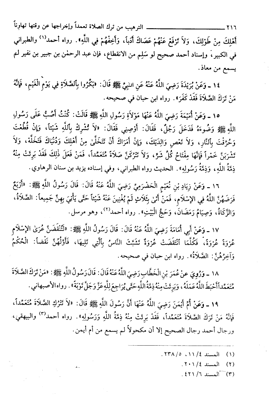 825 - وَعَن أم أَيمن رَضِي الله عَنْهَا أَن رَسُول الله صلى الله عَلَيْهِ وَسلم قَالَ لَا تتْرك الصَّلَاة مُتَعَمدا فَإِنَّهُ من ترك الصَّلَاة مُتَعَمدا فقد بَرِئت مِنْهُ ذمَّة الله وَرَسُوله