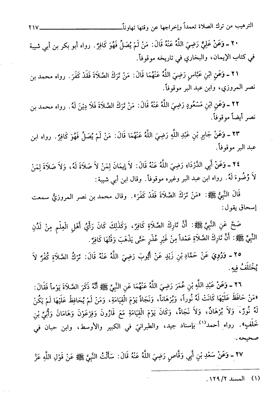 827 - وَعَن ابْن عَبَّاس رَضِي الله عَنْهُمَا قَالَ من ترك الصَّلَاة فقد كفر