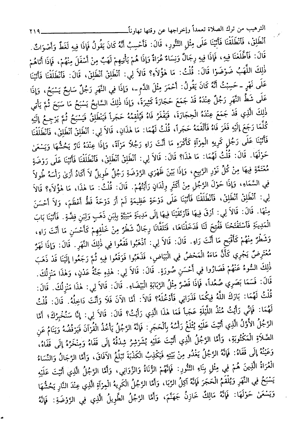 قَالَ قلت لَهما فَإِنِّي رَأَيْت مُنْذُ اللَّيْلَة عجبا فَمَا هَذَا الَّذِي رَأَيْت قَالَ قَالَا لي إِنَّا سنخبرك أما الرجل الأول الَّذِي أتيت عَلَيْهِ يثلغ رَأسه بِالْحجرِ فَإِنَّهُ الرجل يَأْخُذ الْقُرْآن فيرفضه وينام عَن الصَّلَاة الْمَكْتُوبَة وَأما الرجل الَّذِي أتيت عَلَيْهِ يشرشر شدقه إِلَى قَفاهُ ومنخره إِلَى قَفاهُ وعينه إِلَى قَفاهُ فَإِنَّهُ الرجل يَغْدُو من بَيته فيكذب الكذبة تبلغ الْآفَاق وَأما الرِّجَال وَالنِّسَاء العراة الَّذين هم فِي مثل بِنَاء التَّنور فَإِنَّهُم الزناة والزواني وَأما الرجل الَّذِي أتيت عَلَيْهِ يسبح فِي النَّهر ويلقم الْحجر فَإِنَّهُ آكل الرِّبَا وَأما الرجل الكريه الْمرْآة الَّذِي عِنْد النَّار يحشها وَيسْعَى حولهَا فَإِنَّهُ مَالك خَازِن جَهَنَّم وَأما الرجل الطَّوِيل الَّذِي فِي الرَّوْضَة فَإِنَّهُ