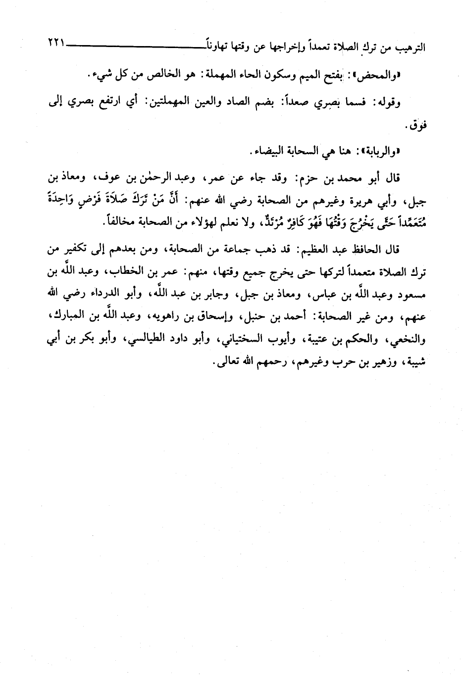 قَالَ الْحَافِظ عبد الْعَظِيم قد ذهب جمَاعَة من الصَّحَابَة وَمن بعدهمْ إِلَى تَكْفِير من ترك الصَّلَاة مُتَعَمدا لتركها حَتَّى يخرج جَمِيع وَقتهَا مِنْهُم عمر بن الْخطاب وَعبد الله بن مَسْعُود وَعبد الله بن عَبَّاس ومعاذ بن جبل وَجَابِر بن عبد الله وَأَبُو الدَّرْدَاء رَضِي الله عَنْهُم وَمن غير الصَّحَابَة أَحْمد بن حَنْبَل وَإِسْحَاق بن رَاهَوَيْه وَعبد الله بن الْمُبَارك وَالنَّخَعِيّ وَالْحكم بن عتيبة وَأَيوب السّخْتِيَانِيّ وَأَبُو دَاوُد الطَّيَالِسِيّ وَأَبُو بكر بن أبي شيبَة وَزُهَيْر بن حَرْب وَغَيرهم رَحِمهم الله تَعَالَى