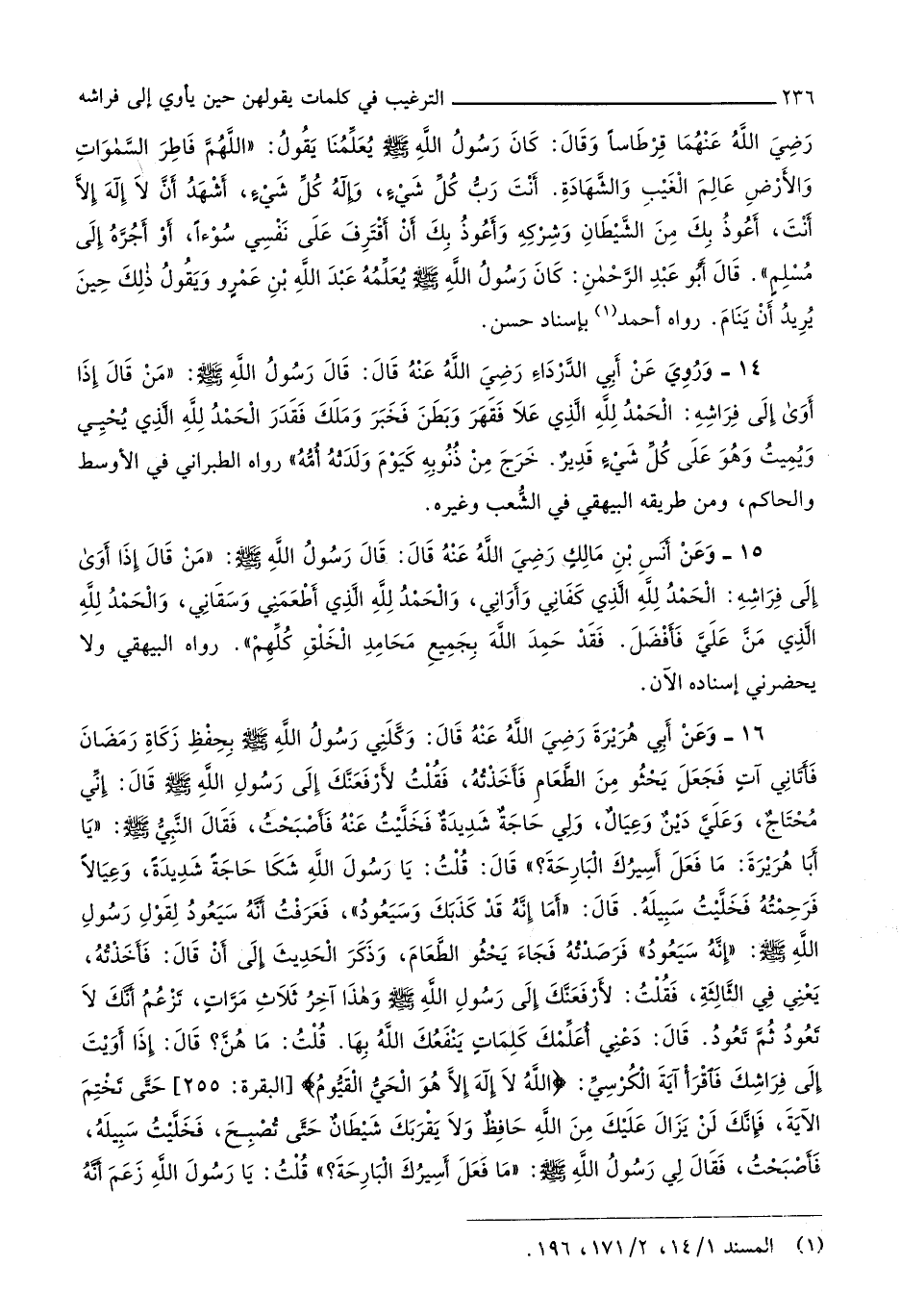897 - وَرُوِيَ عَن أبي الدَّرْدَاء رَضِي الله عَنهُ قَالَ قَالَ رَسُول الله صلى الله عَلَيْهِ وَسلم من قَالَ إِذا أَوَى إِلَى فرَاشه الْحَمد لله الَّذِي علا فقهر وبطن فخبر وَملك فَقدر الْحَمد لله الَّذِي يحيي وَيُمِيت وَهُوَ على كل شَيْء قدير