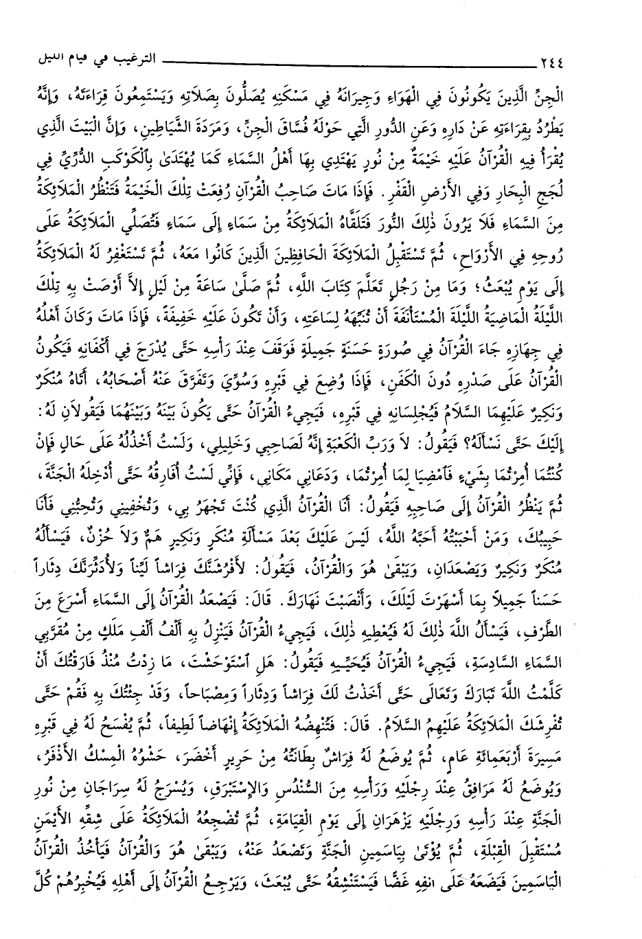 فَإِذا مَاتَ صَاحب الْقُرْآن رفعت تِلْكَ الْخَيْمَة فتنظر الْمَلَائِكَة من السَّمَاء فَلَا يرَوْنَ ذَلِك النُّور فَتَلقاهُ الْمَلَائِكَة من سَمَاء إِلَى سَمَاء فَتُصَلِّي الْمَلَائِكَة على روحه فِي الْأَرْوَاح ثمَّ تسْتَقْبل الْمَلَائِكَة الحافظين الَّذين كَانُوا مَعَه ثمَّ تستغفر لَهُ الْمَلَائِكَة إِلَى يَوْم يبْعَث وَمَا من رجل تعلم كتاب الله ثمَّ صلى سَاعَة من ليل إِلَّا أوصت بِهِ تِلْكَ اللَّيْلَة الْمَاضِيَة اللَّيْلَة المستأنفة أَن تنبهه لساعته وَأَن تكون عَلَيْهِ خَفِيفَة فَإِذا مَاتَ وَكَانَ أَهله فِي جهازه جَاءَ الْقُرْآن فِي صُورَة حَسَنَة جميلَة فَوقف عِنْد رَأسه حَتَّى يدرج فِي أَكْفَانه فَيكون الْقُرْآن على صَدره دون الْكَفَن فَإِذا وضع فِي قَبره وسوي وتفرق عَنهُ أَصْحَابه أَتَاهُ مُنكر وَنَكِير عَلَيْهِمَا السَّلَام فيجلسانه فِي قَبره فَيَجِيء الْقُرْآن حَتَّى يكون بَينه وَبَينهمَا فَيَقُولَانِ لَهُ إِلَيْك حَتَّى نَسْأَلهُ فَيَقُول لَا وَرب الْكَعْبَة إِنَّه لصاحبي وخليلي وَلست أخذله على حَال فَإِن كنتما أمرتما بِشَيْء فامضيا لما أمرتما وَدَعَانِي مَكَاني فَإِنِّي لست أفارقه حَتَّى أدخلهُ الْجنَّة ثمَّ ينظر الْقُرْآن إِلَى صَاحبه فَيَقُول أَنا الْقُرْآن الَّذِي كنت تجْهر بِي وتخفيني وتحبني فَأَنا حَبِيبك وَمن أحببته أحبه الله لَيْسَ عَلَيْك بعد مَسْأَلَة مُنكر وَنَكِير هم وَلَا حزن فيسأله مُنكر وَنَكِير ويصعدان وَيبقى هُوَ وَالْقُرْآن فَيَقُول لأفرشنك فراشا لينًا ولأدثرنك دثارا حسنا جميلا بِمَا أَسهرت ليلك وأنصبت نهارك