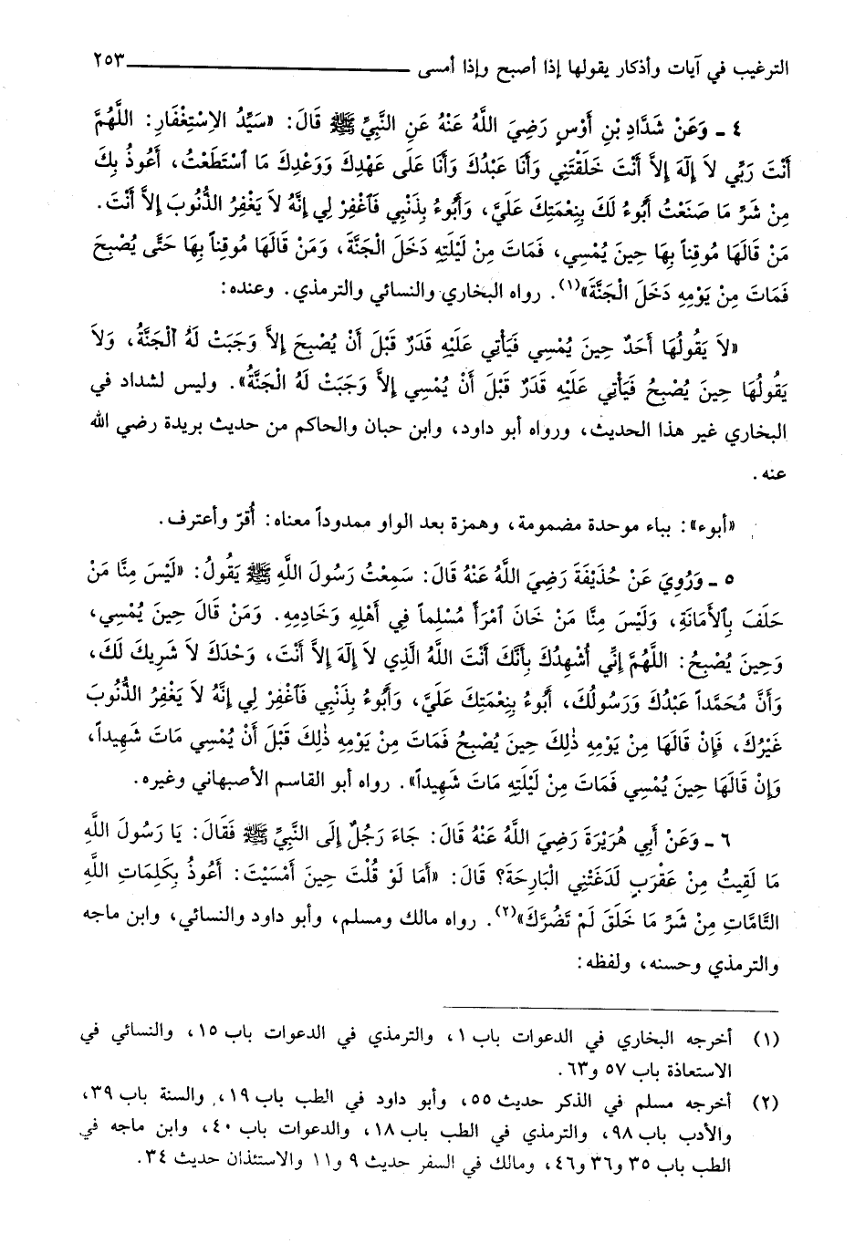 وَمن قَالَ حِين يُمْسِي وَحين يصبح اللَّهُمَّ إِنِّي أشهدك بأنك أَنْت الله الَّذِي لَا إِلَه إِلَّا أَنْت وَحدك لَا شريك لَك وَأَن مُحَمَّدًا عَبدك وَرَسُولك أَبُوء بنعمتك عَليّ وأبوء بذنبي فَاغْفِر لي إِنَّه لَا يغْفر الذُّنُوب غَيْرك فَإِن قَالَهَا من يَوْمه ذَلِك حِين يصبح فَمَاتَ من يَوْمه ذَلِك قبل أَن يُمْسِي مَاتَ شَهِيدا وَإِن قَالَهَا حِين يُمْسِي فَمَاتَ من ليلته مَاتَ شَهِيدا