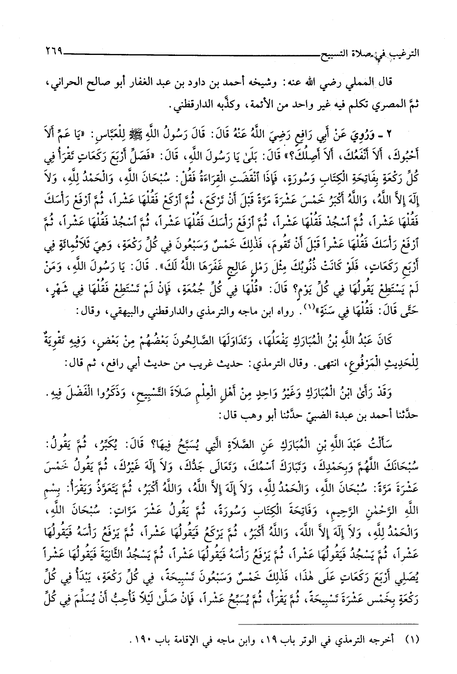 وَقَالَ التِّرْمِذِيّ حَدِيث غَرِيب من حَدِيث أبي رَافع ثمَّ قَالَ وَقد رأى ابْن الْمُبَارك وَغير وَاحِد من أهل الْعلم صَلَاة التَّسْبِيح وَذكروا الْفضل فِيهِ