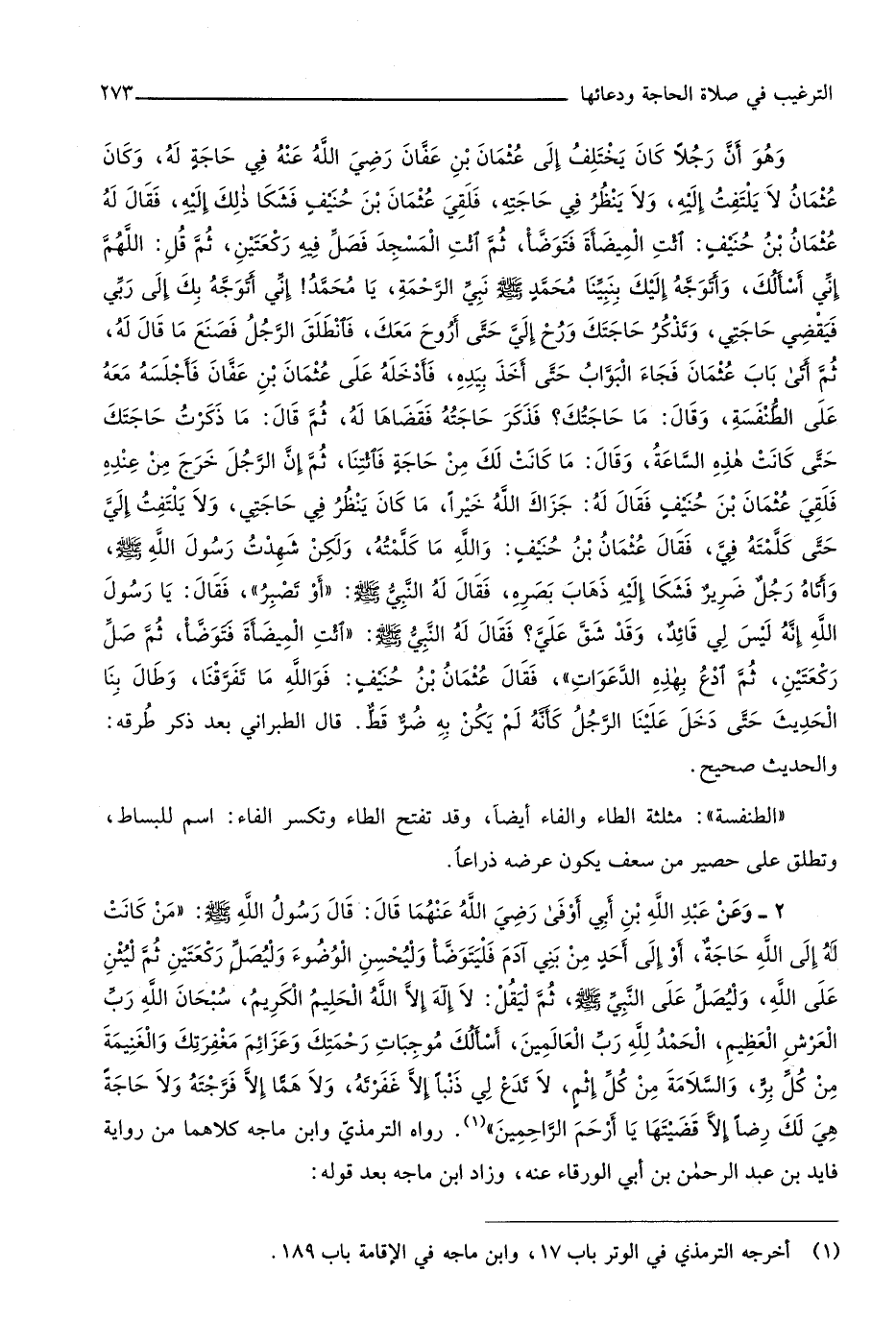 وَهُوَ أَن رجلا كَانَ يخْتَلف إِلَى عُثْمَان بن عَفَّان رَضِي الله عَنهُ فِي حَاجَة لَهُ وَكَانَ عُثْمَان لَا يلْتَفت إِلَيْهِ وَلَا ينظر فِي حَاجته فلقي عُثْمَان بن حنيف فَشَكا ذَلِك إِلَيْهِ فَقَالَ لَهُ عُثْمَان بن حنيف ائْتِ الميضأة فَتَوَضَّأ ثمَّ ائْتِ الْمَسْجِد فصل فِيهِ رَكْعَتَيْنِ ثمَّ قل اللَّهُمَّ إِنِّي أَسأَلك وأتوجه إِلَيْك بنبينا مُحَمَّد صلى الله عَلَيْهِ وَسلم نَبِي الرَّحْمَة يَا مُحَمَّد إِنِّي أتوجه بك إِلَى رَبِّي فَيَقْضِي حَاجَتي وتذكر حَاجَتك ورح إِلَيّ حَتَّى أروح مَعَك فَانْطَلق الرجل فَصنعَ مَا قَالَ لَهُ ثمَّ أَتَى بَاب عُثْمَان فجَاء البواب حَتَّى أَخذ بِيَدِهِ فَأدْخلهُ على عُثْمَان بن عَفَّان فأجلسه مَعَه على الطنفسة وَقَالَ مَا حَاجَتك فَذكر حَاجته فقضاها لَهُ ثمَّ قَالَ مَا ذكرت حَاجَتك حَتَّى كَانَت هَذِه السَّاعَة وَقَالَ مَا كَانَت لَك من حَاجَة فائتنا ثمَّ إِن الرجل خرج من عِنْده فلقي عُثْمَان بن حنيف فَقَالَ لَهُ جَزَاك الله خيرا مَا كَانَ ينظر فِي حَاجَتي وَلَا يلْتَفت إِلَيّ حَتَّى كَلمته فِي فَقَالَ عُثْمَان بن حنيف وَالله مَا كَلمته وَلَكِن شهِدت رَسُول الله صلى الله عَلَيْهِ وَسلم وَأَتَاهُ رجل ضَرِير فَشَكا إِلَيْهِ ذهَاب بَصَره فَقَالَ لَهُ النَّبِي صلى الله عَلَيْهِ وَسلم أَو تصبر فَقَالَ يَا رَسُول الله إِنَّه لَيْسَ لي قَائِد وَقد شقّ عَليّ فَقَالَ لَهُ النَّبِي صلى الله عَلَيْهِ وَسلم ائْتِ الميضأة فَتَوَضَّأ ثمَّ صل رَكْعَتَيْنِ ثمَّ ادْع بِهَذِهِ الدَّعْوَات فَقَالَ عُثْمَان بن حنيف فوَاللَّه مَا تفرقنا وَطَالَ بِنَا الحَدِيث حَتَّى دخل علينا الرجل كَأَنَّهُ لم يكن بِهِ ضرّ قطّ